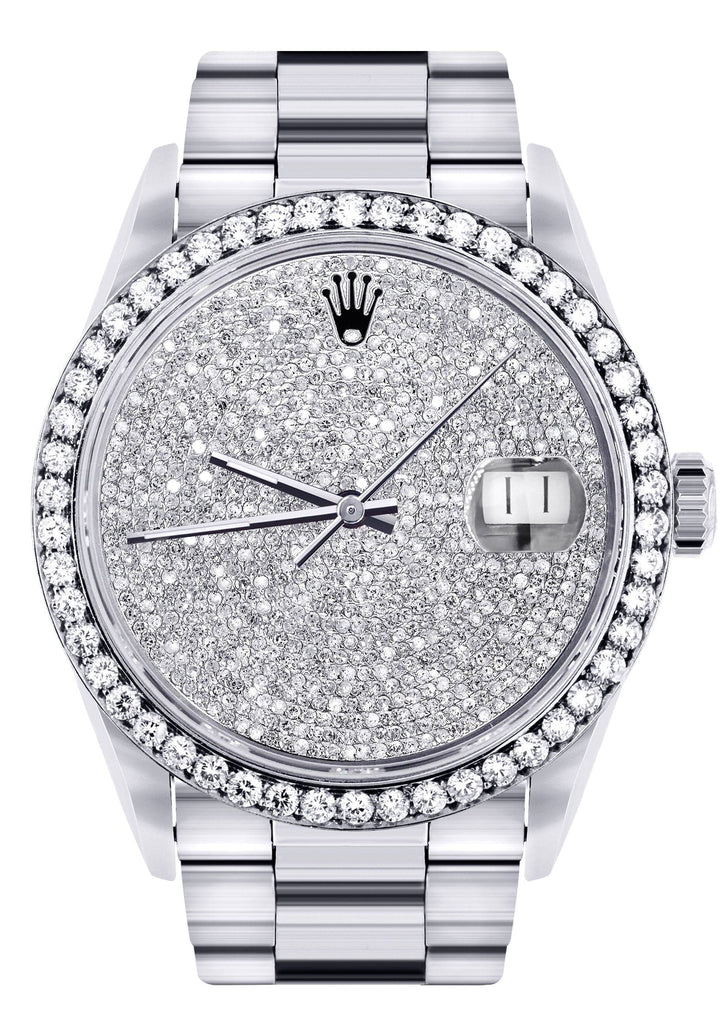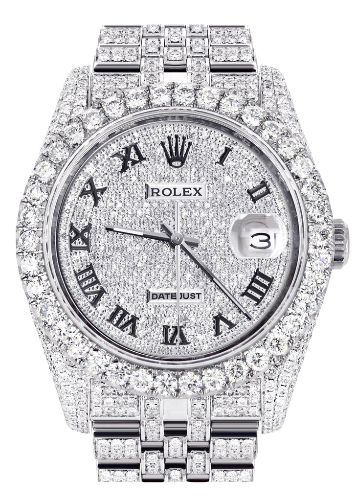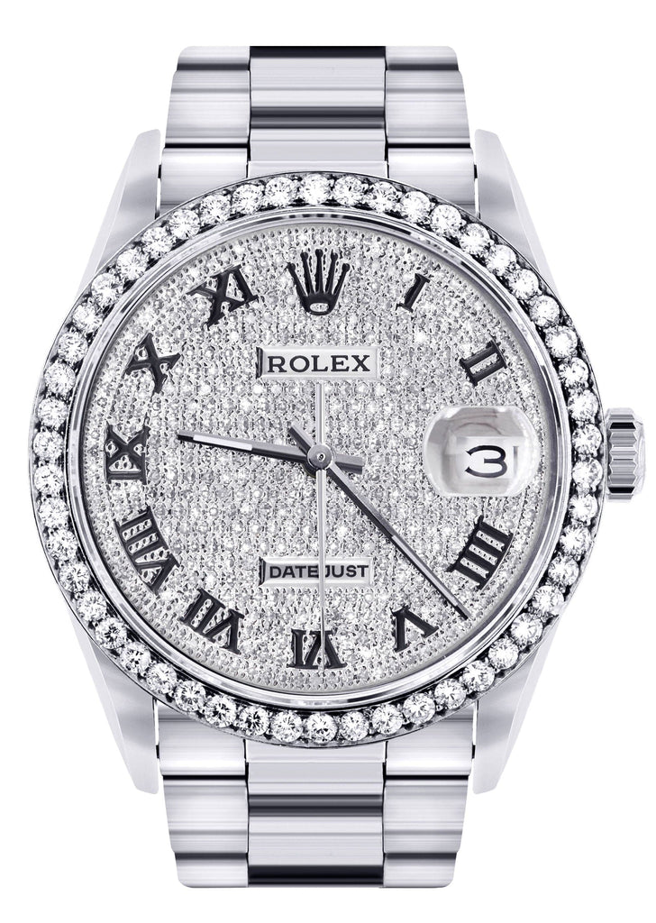 Iced Out Rolex Datejust 36 MM | Stainless Steel | 10 Carats of Diamonds | Full Diamond Color Roman Diamond Dial | Oyster Band