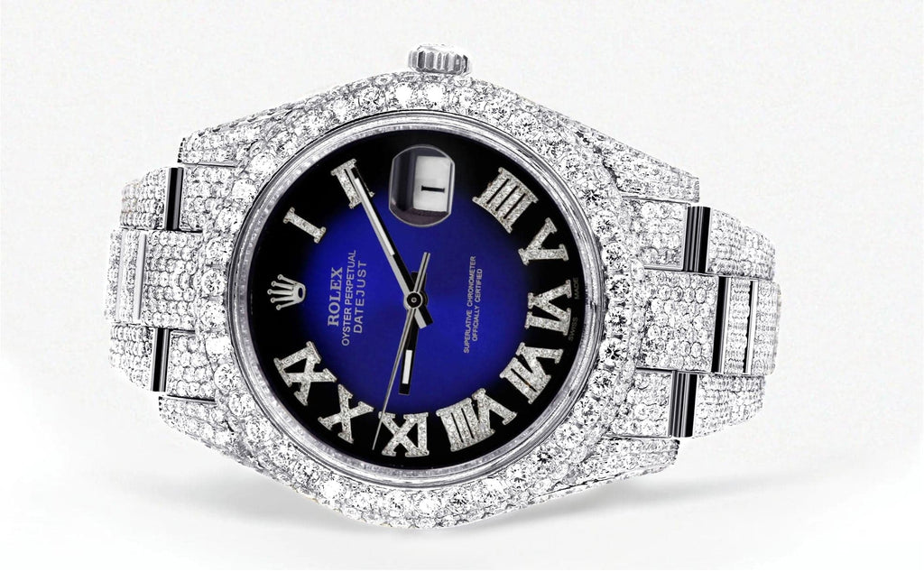 Diamond Iced Out Rolex Datejust 41 | 25 Carats Of Diamonds | Custom Blue Black Roman Numeral Diamond Dial | Two Row | Oyster Band