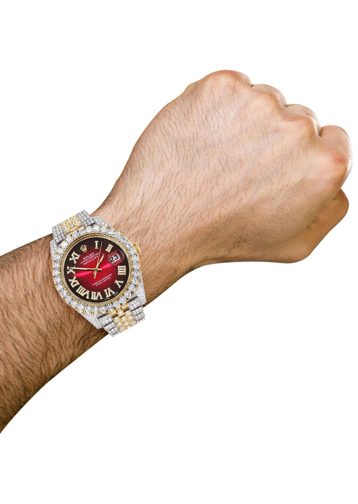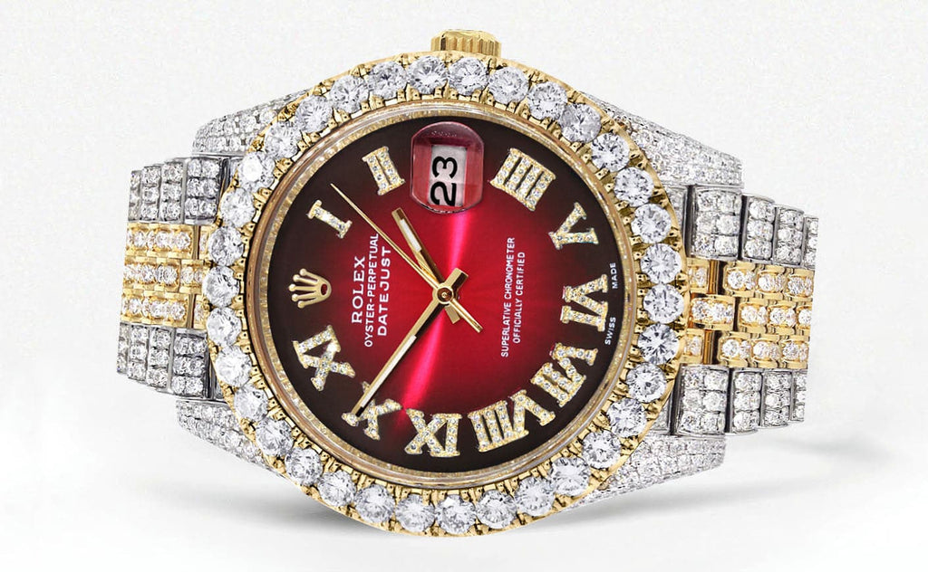 Diamond Iced Out Rolex Datejust 41 | 25 Carats Of Diamonds | Custom Red Black Dial | Two Tone | Jubilee Band