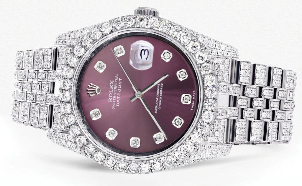 Iced Out Rolex Datejust 36 MM | Stainless Steel | 16.5 Carats of Diamonds | Purple Diamond Dial | Jubilee Band | Model 116200