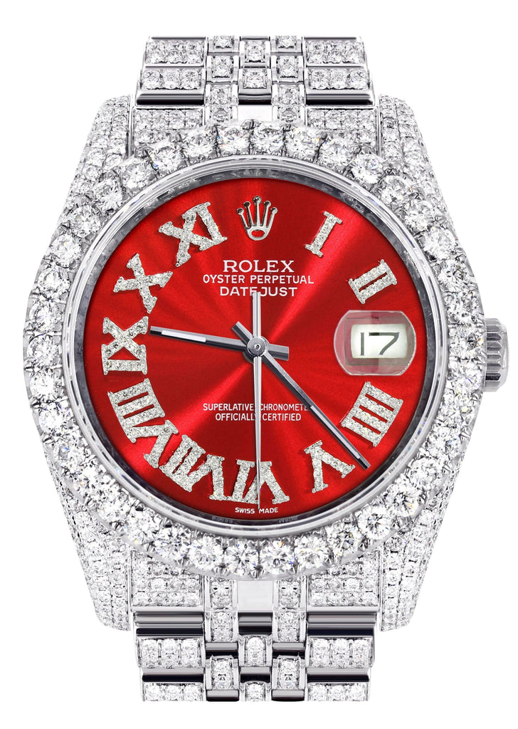 Iced Out Rolex Datejust 36 MM | Stainless Steel | 16.5 Carats of Diamonds | Red Roman Diamond Dial | Jubilee Band | Model 116200