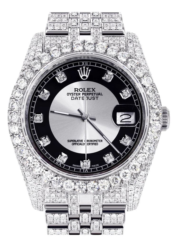 Iced Out Rolex Datejust 36 MM | Stainless Steel | 10 Carats of Diamonds | Black Roman Diamond Dial | Jubilee Band