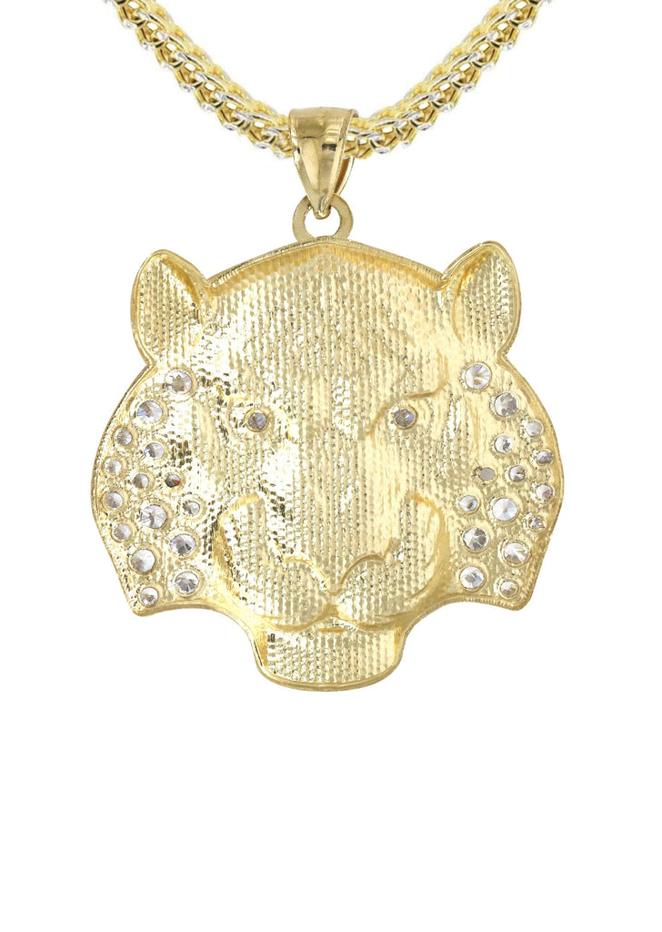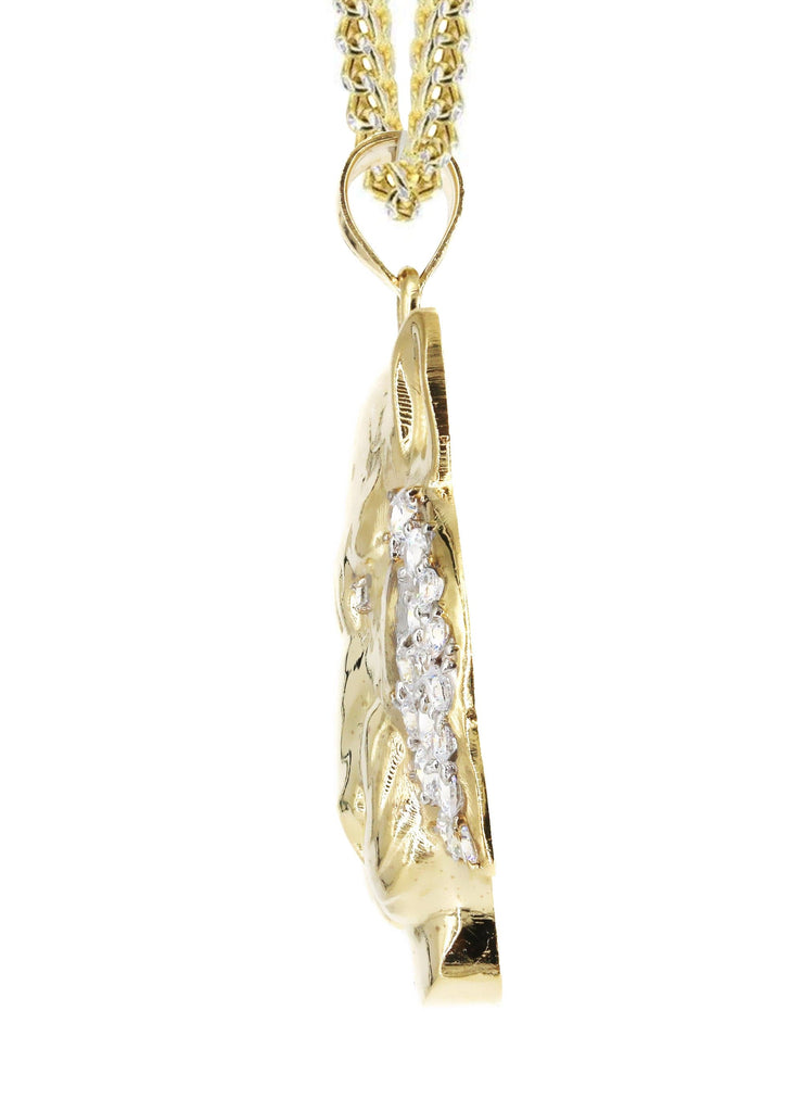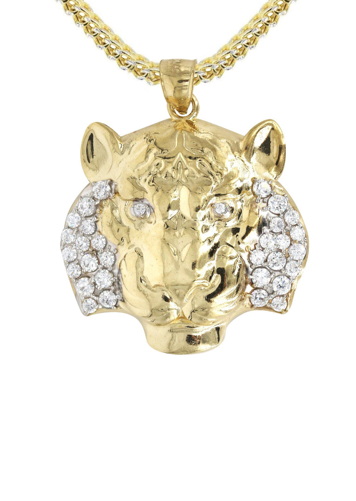 Franco Chain And Lion Pendant With An Approximate Total Gram Weight Of 19.4. Pendant Weighs 9.4 Grams And The Chain Weighs 10 Grams. The Pendant Measurement Is 1.4 Inches In Width And A Length Of 1.8 Inches. The Width Of The Chain Is 3 Mm And The Length Of The Chain Can Be Adjusted.