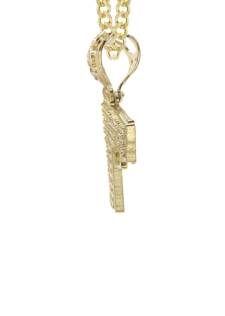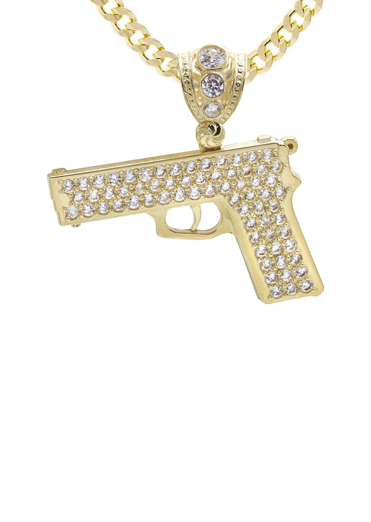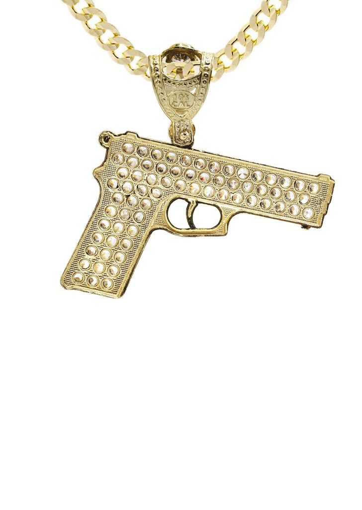 10K Gold Chain And Cz Glock Gun Pendant With An Approximate Total Gram Weight Of 16.3. Pendant Weighs 6.3 Grams And The Chain Weighs 10 Grams. The Pendant Measurement Is 1.5 inches In Width And A Length Of 1.6 inches. The Width Of The Chain Is 3 Mm The Length And Type Of The Chain Can Be Adjusted.