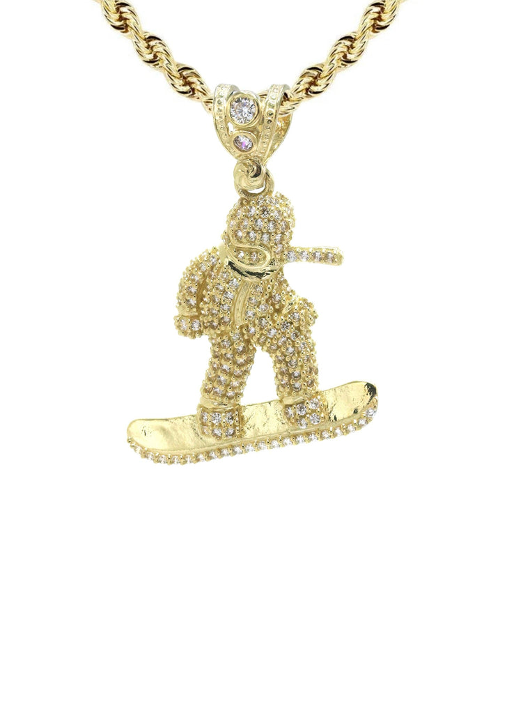10K Gold Chain And Cz Snowboarder Pendant With An Approximate Total Gram Weight Of 15.9. Pendant Weighs 5.9 Grams And The Chain Weighs 10 Grams. The Pendant Measurement Is 1 inches In Width And A Length Of 1.5 inches. The Width Of The Chain Is 3 Mm The Length And Type Of The Chain Can Be Adjusted.