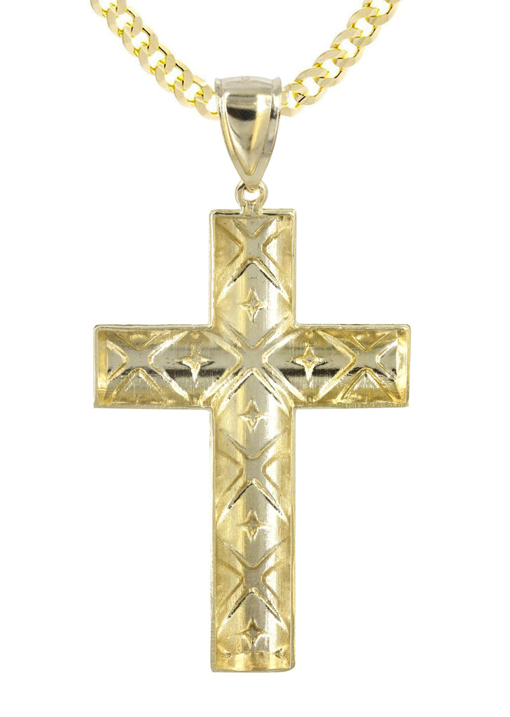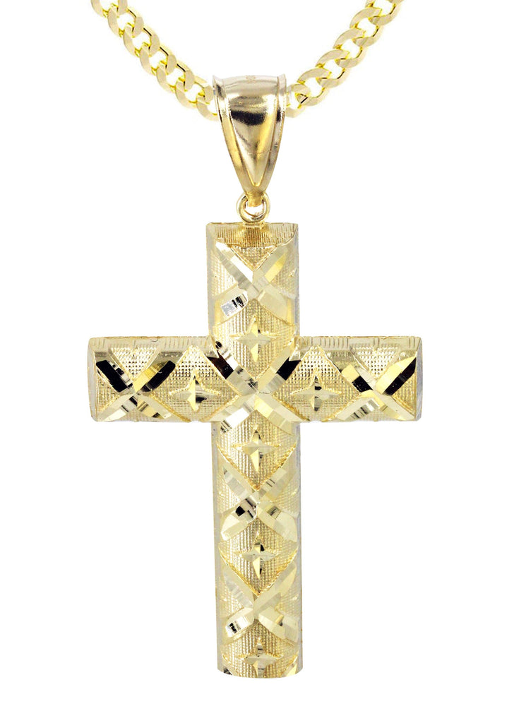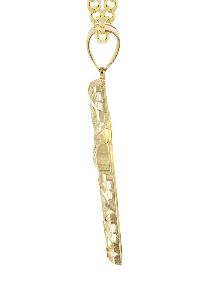 Cuban Chain And Crucifix Pendant With An Approximate Total Gram Weight Of 16.5. Pendant Weighs 10 Grams And The Chain Weighs 10 Grams. The Pendant Measurement Is 1.1 Inches In Width And A Length Of 2.2 Inches. The Width Of The Chain Is 3 Mm And The Length Of The Chain Can Be Adjusted.