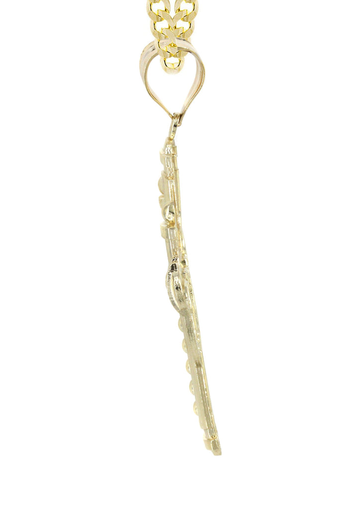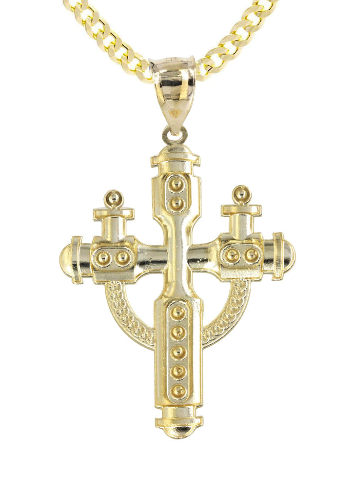 Cuban Chain And Cross Pendant With An Approximate Total Gram Weight Of 14.2. Pendant Weighs 4.2 Grams And The Chain Weighs 10 Grams. The Pendant Measurement Is 1.3 Inches In Width And A Length Of 2.2 Inches. The Width Of The Chain Is 3 Mm And The Length Of The Chain Can Be Adjusted.