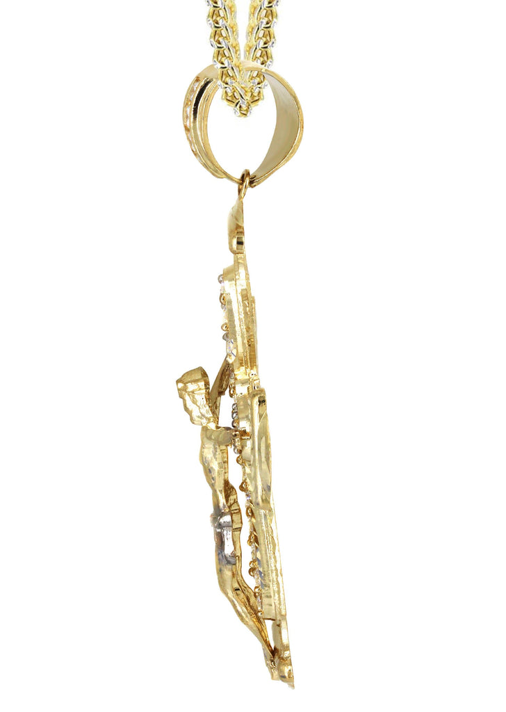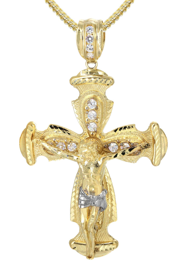 Franco Chain And Crucifix Pendant With An Approximate Total Gram Weight Of 26.4. Pendant Weighs 16.4 Grams And The Chain Weighs 10 Grams. The Pendant Measurement Is 2.2 Inches In Width And A Length Of 3.7 Inches. The Width Of The Chain Is 3 Mm And The Length Of The Chain Can Be Adjusted.