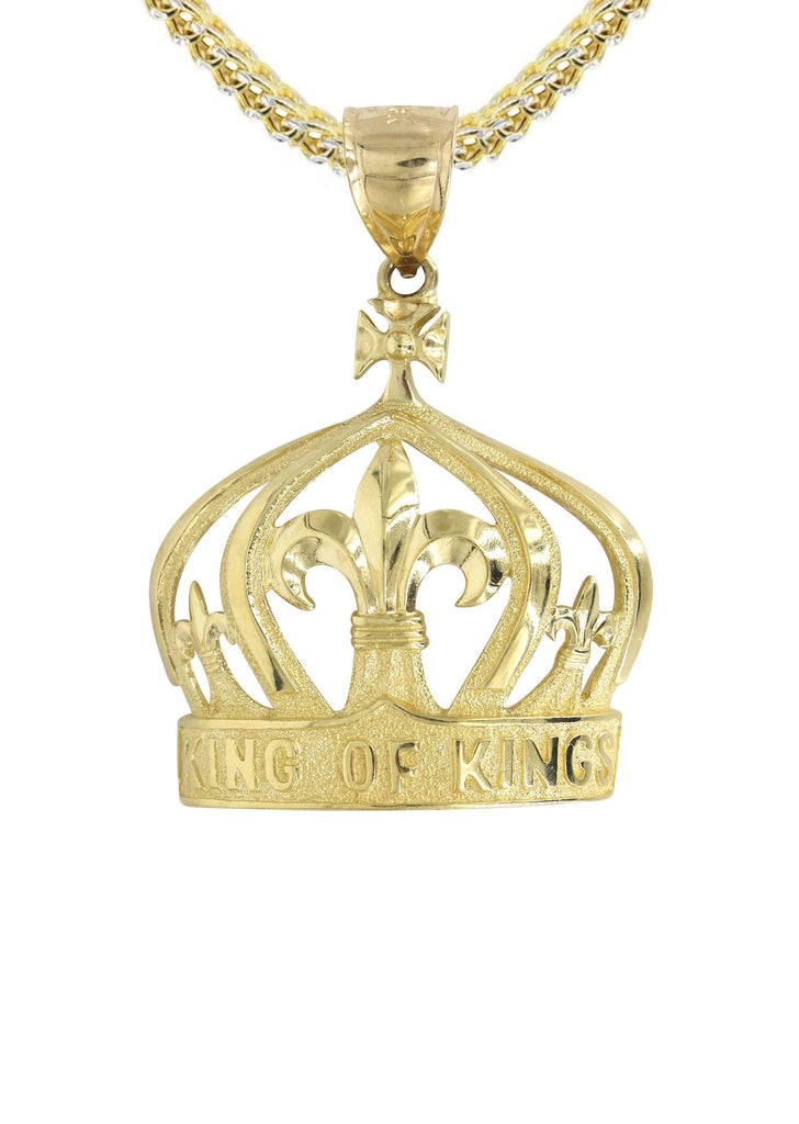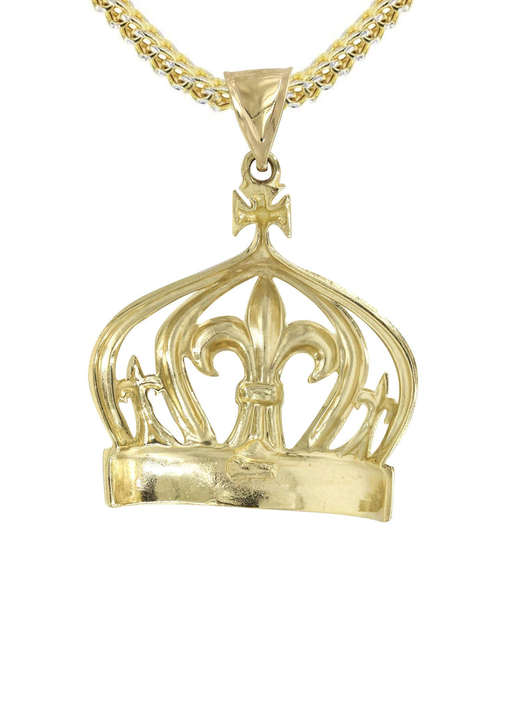 Franco Chain And Crown Pendant With An Approximate Total Gram Weight Of 20.2. Pendant Weighs 10.2 Grams And The Chain Weighs 10 Grams. The Pendant Measurement Is 1.4 inches In Width And A Length Of 2 inches. The Width Of The Chain Is 3 Mm And The Length Of The Chain Can Be Adjusted.