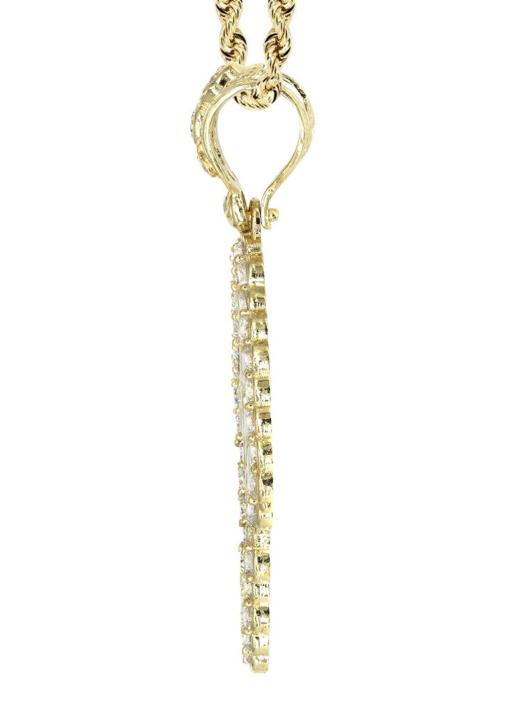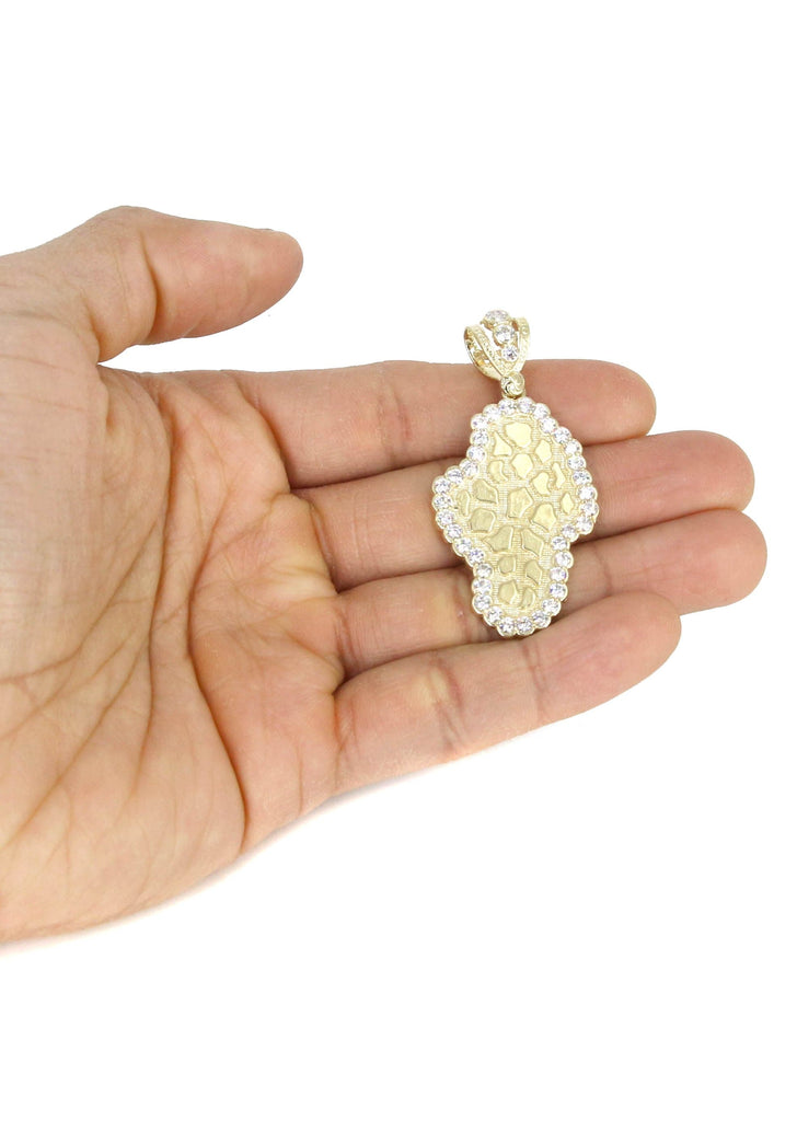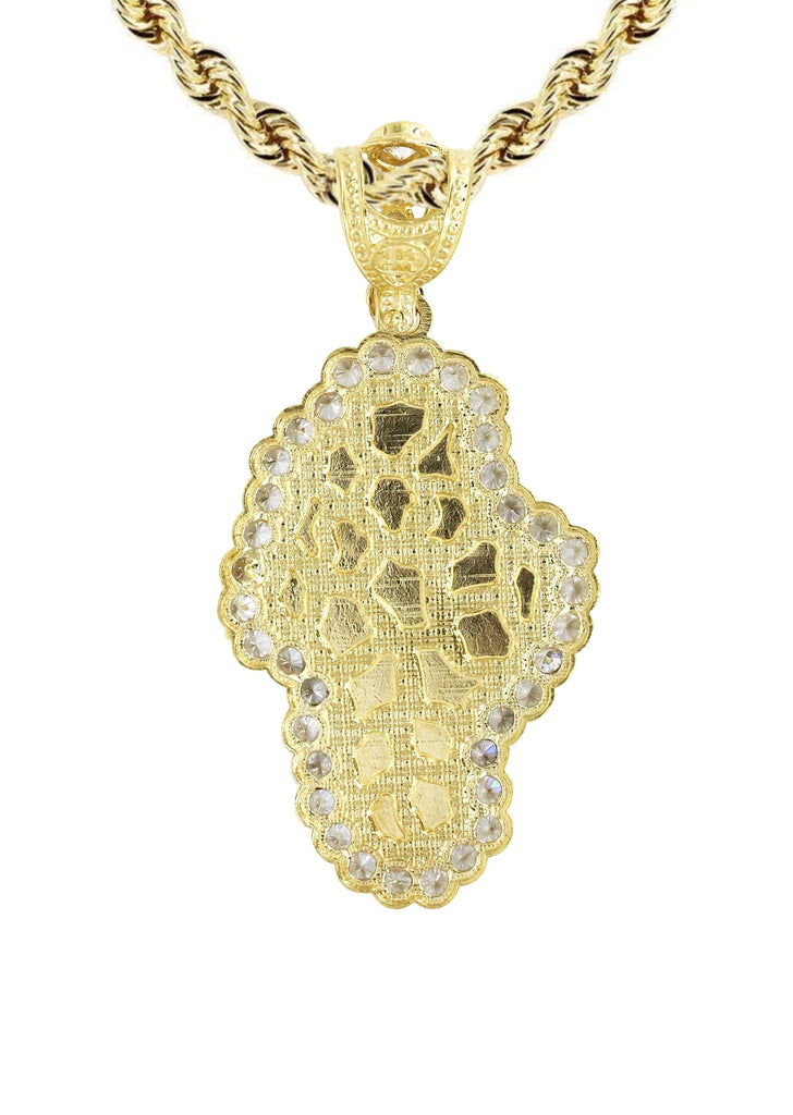 Rope Chain And Nugget Pendant With An Approximate Total Gram Weight Of 17.2. Pendant Weighs 7.2 Grams And The Chain Weighs 10 Grams. The Pendant Measurement Is 1 inches In Width And A Length Of 2.2 inches. The Width Of The Chain Is 3 Mm And The Length Of The Chain Can Be Adjusted.