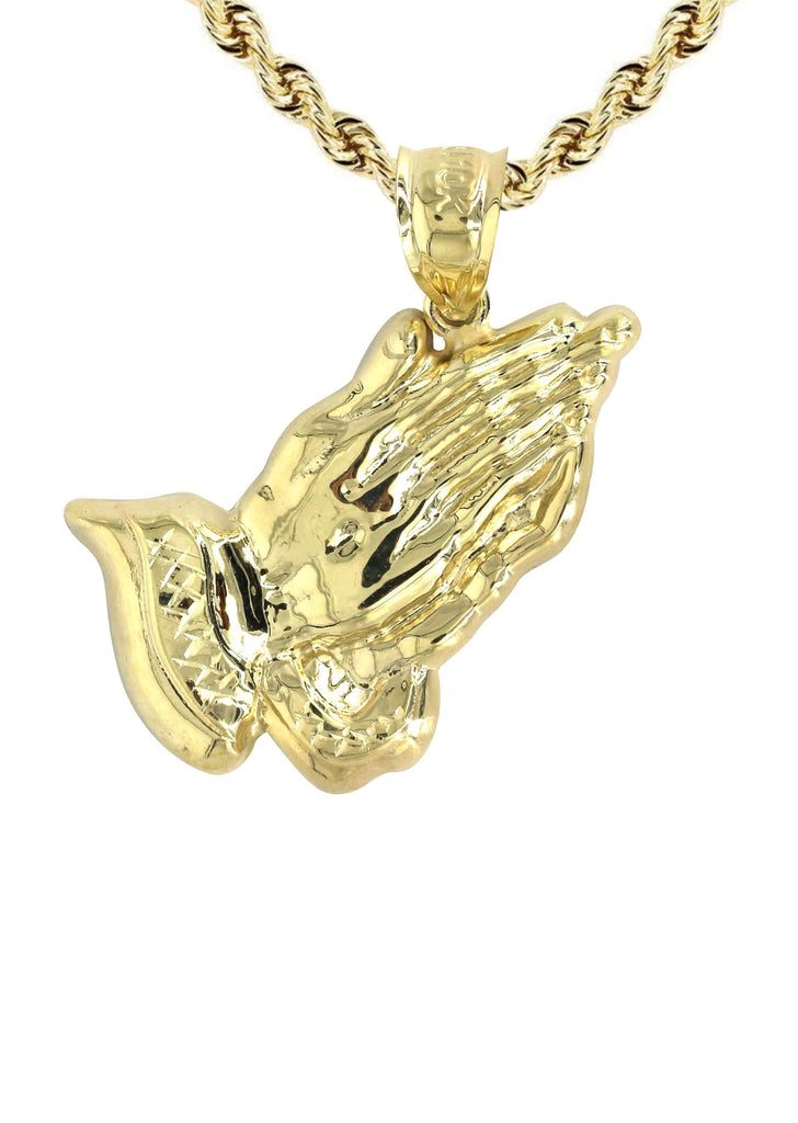 Rope Chain And Praying Hands Pendant With An Approximate Total Gram Weight Of 12.6. Pendant Weighs 2.6 Grams And The Chain Weighs 10 Grams. The Pendant Measurement Is 0.9 inches In Width And A Length Of 1.5 inches. The Width Of The Chain Is 3 Mm And The Length Of The Chain Can Be Adjusted.