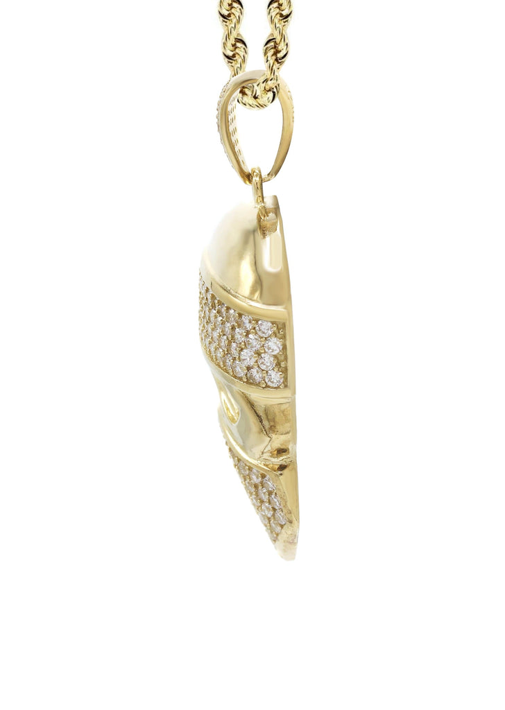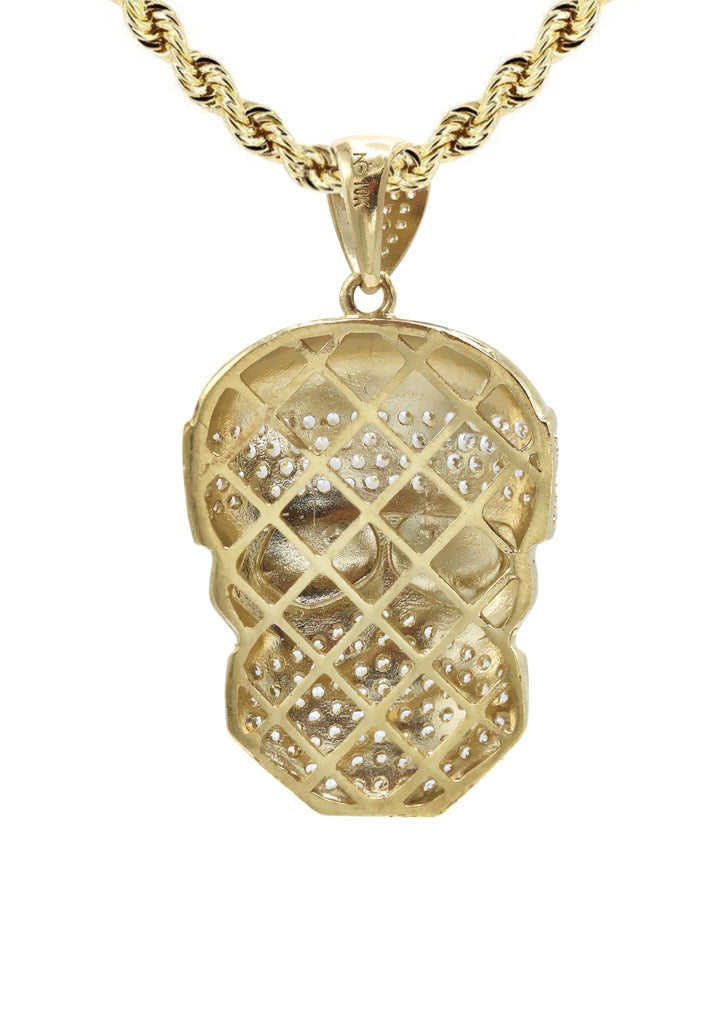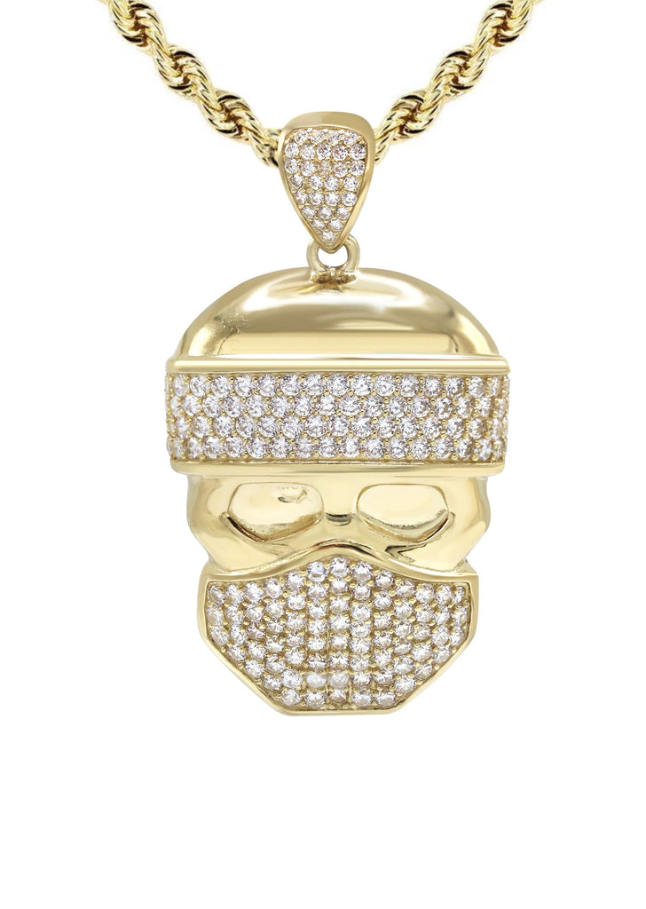 10K Gold Chain And Cz Skull Bandit Pendant With An Approximate Total Gram Weight Of 20. Pendant Weighs 10 Grams And The Chain Weighs 10 Grams. The Pendant Measurement Is 0.98 inches In Width And A Length Of 1.76 inches. The Width Of The Chain Is 3 Mm The Length And Type Of The Chain Can Be Adjusted.