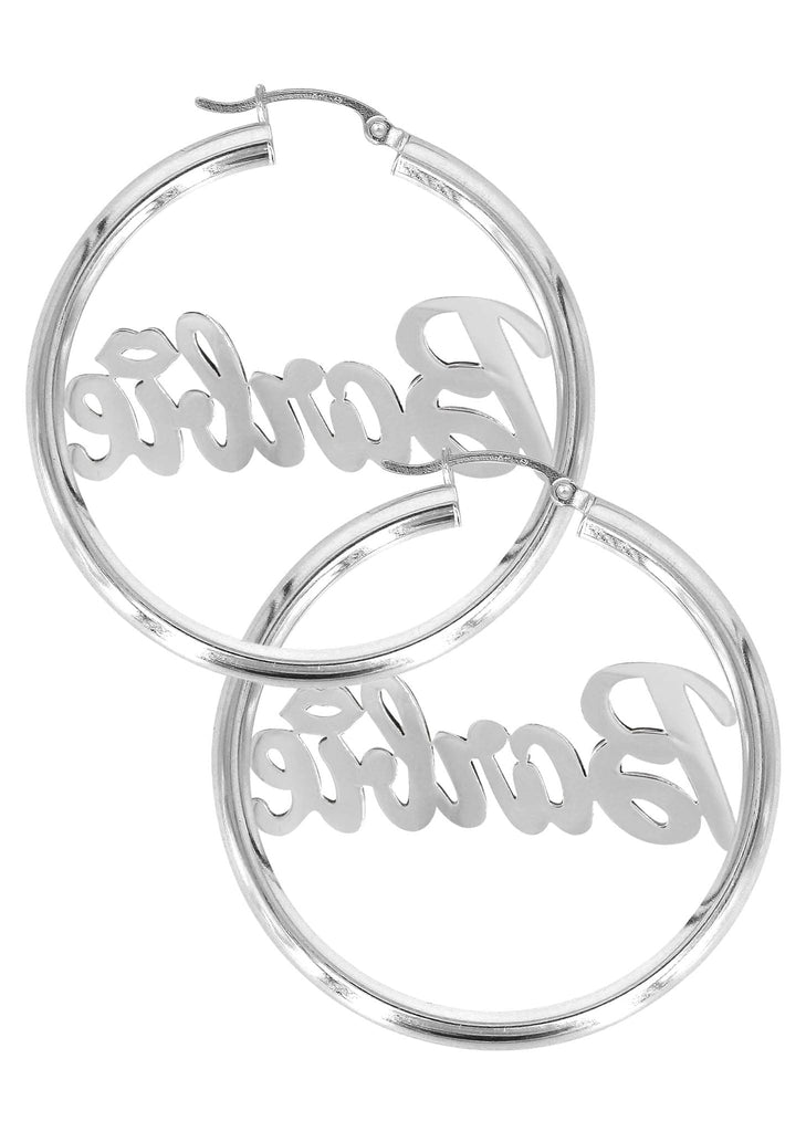 14K Ladies Plain Name Plate Hoop Earrings. The diameter of the hoop earrings can be customized to 1.25 inches, 1.5 inches & 2 inches. Please note that each name plate earring is custom made to order to your specifications so please allow 2-3 weeks for completion. If you have any questions please do not hesitate to call us at 212-730-7879.