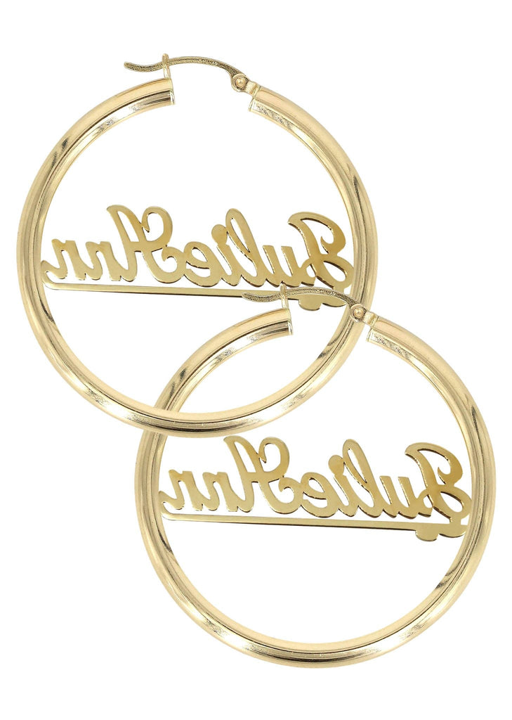 14K Ladies Plain Name Plate Hoop Earrings. The diameter of the hoop earrings can be customized to 1.25 inches, 1.5 inches & 2 inches. Please note that each name plate earring is custom made to order to your specifications so please allow 2-3 weeks for completion. If you have any questions please do not hesitate to call us at 212-730-7879.