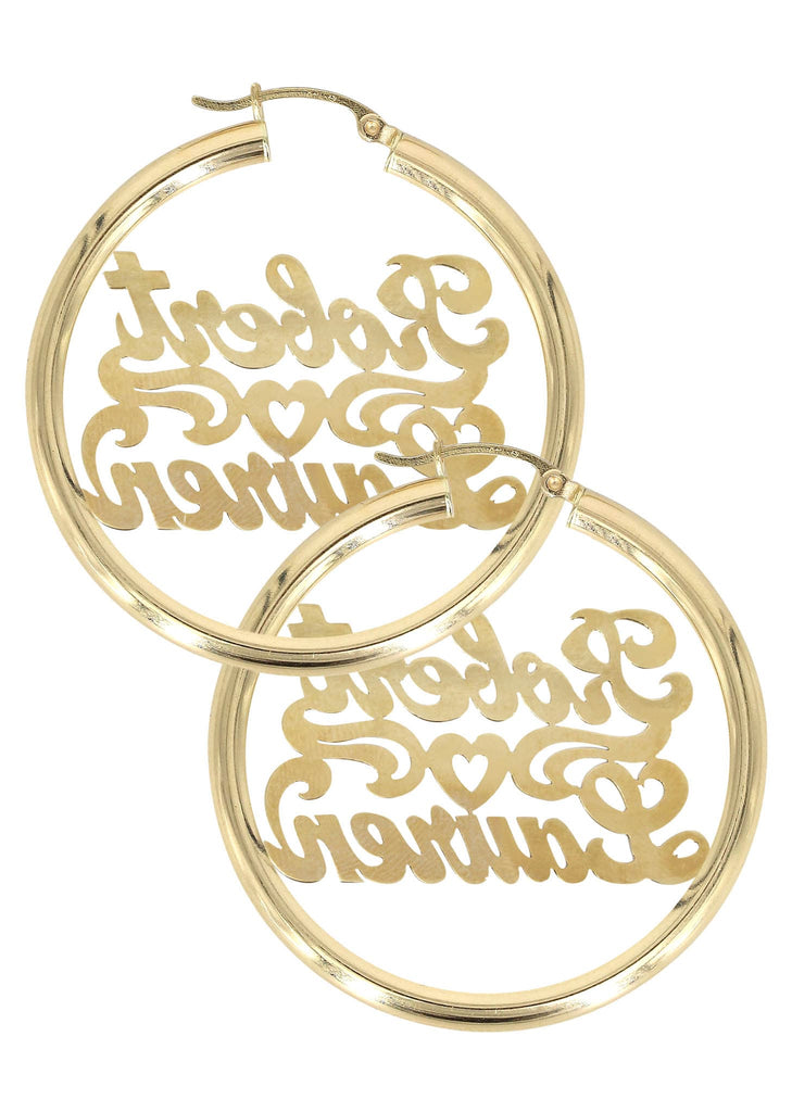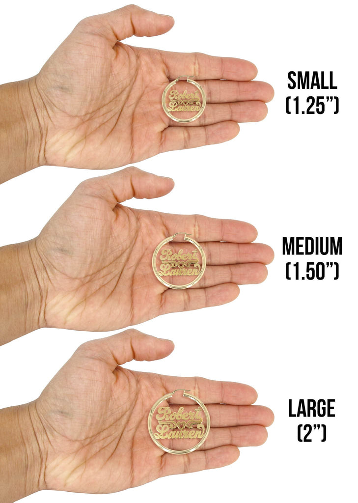 14K Ladies Plain Name Plate Hoop Earrings. The diameter of the hoop earrings can be customized to 1.25 inches, 1.5 inches & 2 inches. Please note that each name plate earring is custom made to order to your specifications so please allow 2-3 weeks for completion. If you have any questions please do not hesitate to call us at 212-730-7879.