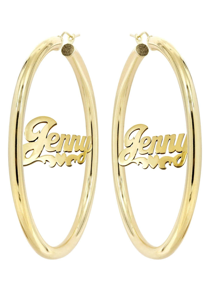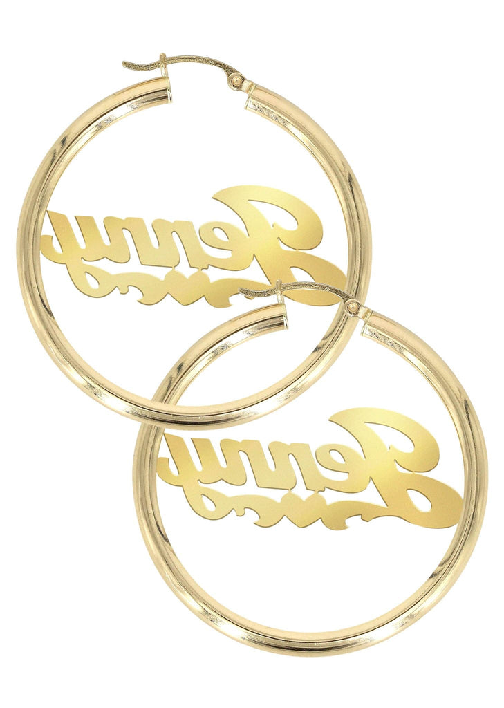 14K Ladies Plain Name Plate Hoop Earrings. The diameter of the hoop earrings can be customized to 1.25 inches, 1.5 inches & 2 inches. Please note that each name plate earring is custom made to order to your specifications so please allow 2-3 weeks for completion. If you have any questions please do not hesitate to call us at 212-730-7879.