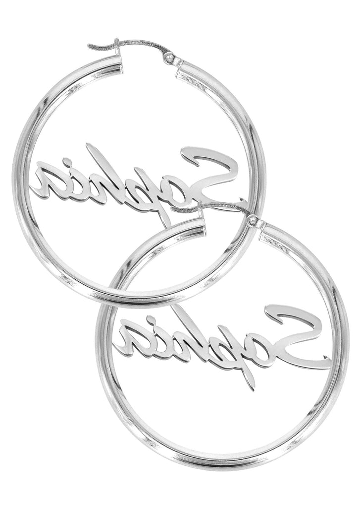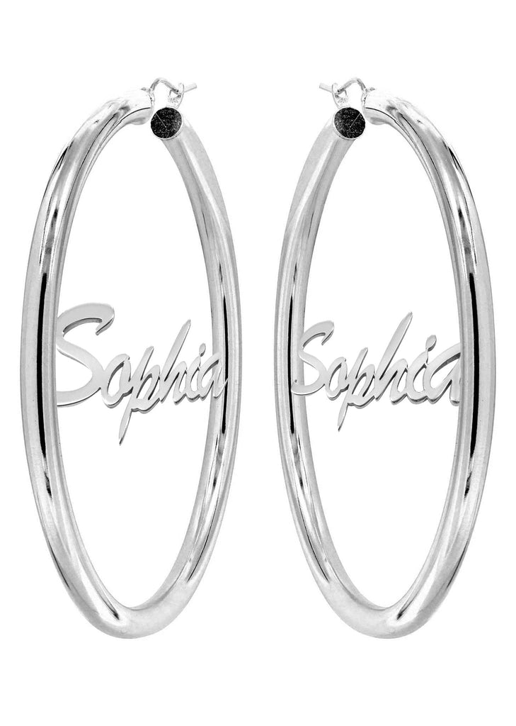 14K Ladies Plain Name Plate Hoop Earrings. The diameter of the hoop earrings can be customized to 1.25 inches, 1.5 inches & 2 inches. Please note that each name plate earring is custom made to order to your specifications so please allow 2-3 weeks for completion. If you have any questions please do not hesitate to call us at 212-730-7879.