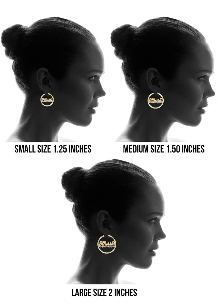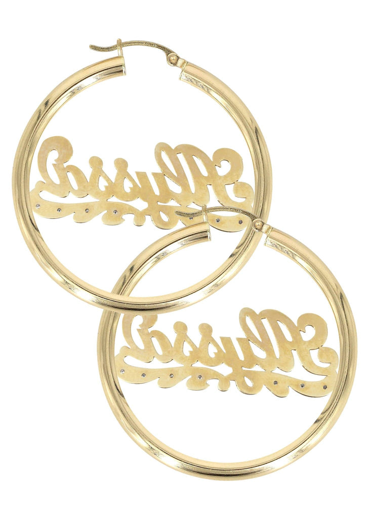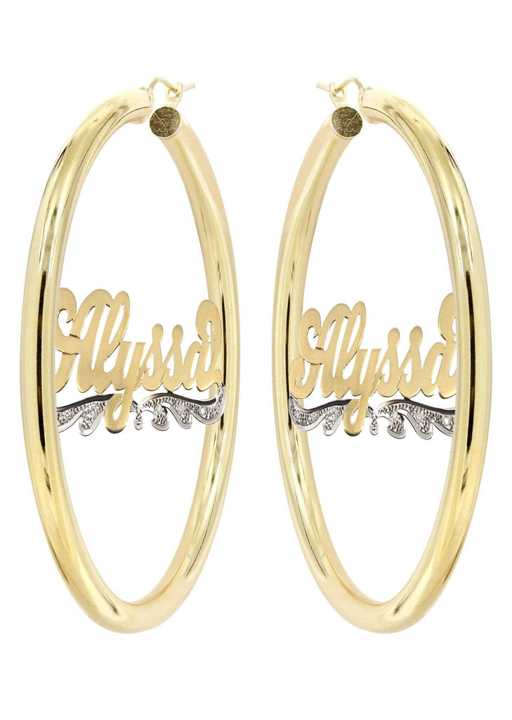 14K Ladies Plain Name Plate Hoop Earrings. The diameter of the hoop earrings can be customized to 1.25 inches, 1.5 inches & 2 inches. Please note that each name plate earring is custom made to order to your specifications so please allow 2-3 weeks for completion. If you have any questions please do not hesitate to call us at 212-730-7879.
