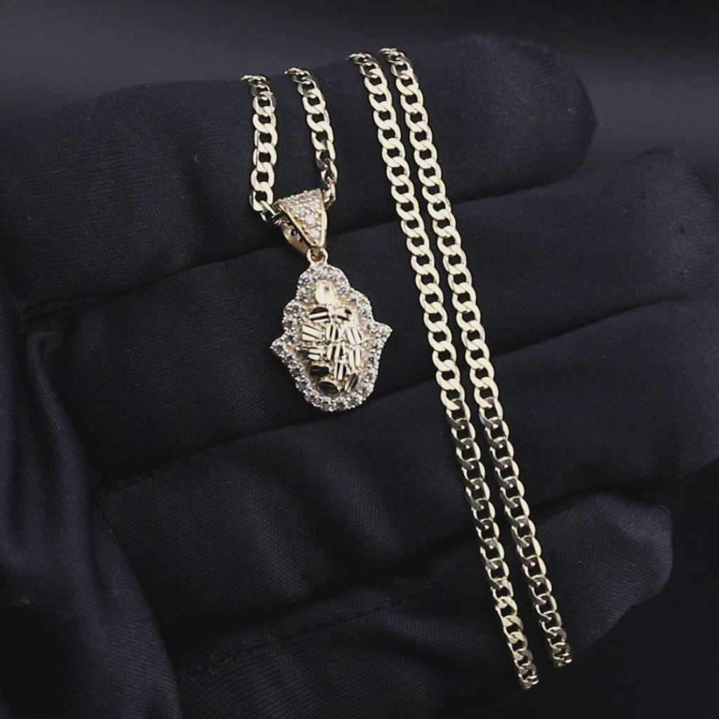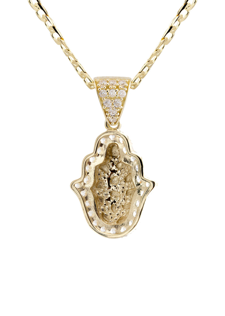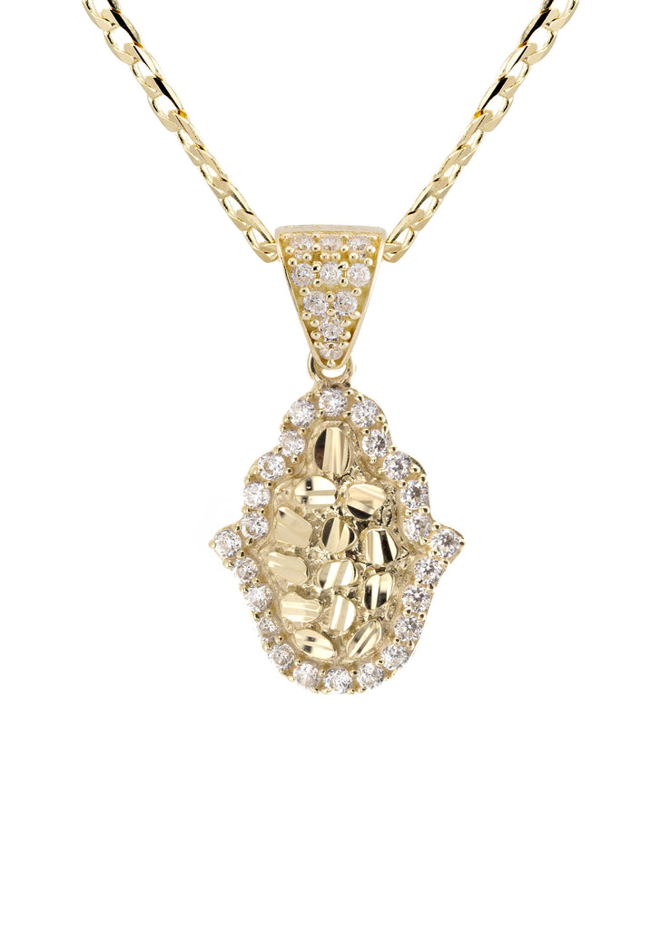 10K Yellow Gold Hamsa Hand Nugget Necklace Encrusted With Cubic Zirconia Crystals With An Approximate Total Gram Weight Of 5.4. Pendant Weighs 1.4 Grams And The Chain Weighs 4 Grams. The Pendant Measurement Is 0.5 inches In Width And A Length Of 0.9 inches. The Length And Type Of The Chain Can Be Adjusted Or Select The No Chain Option.