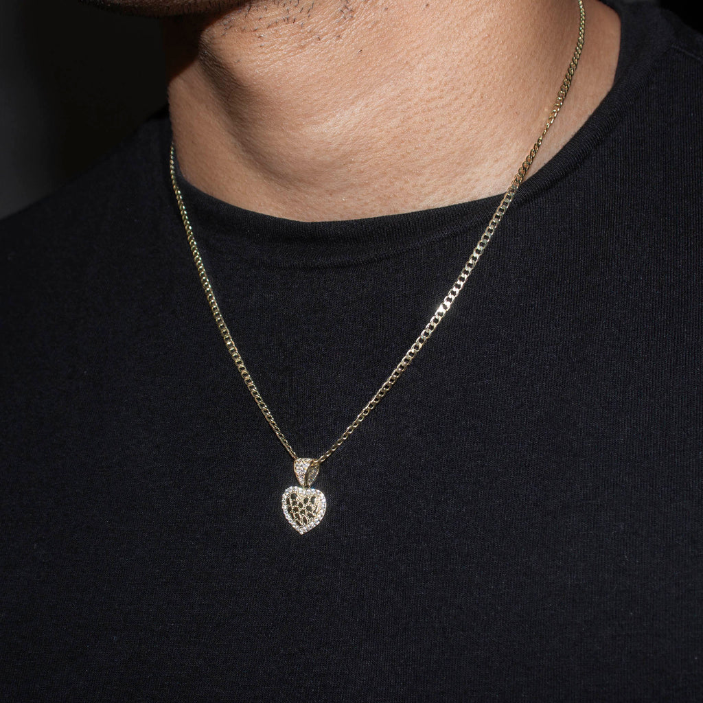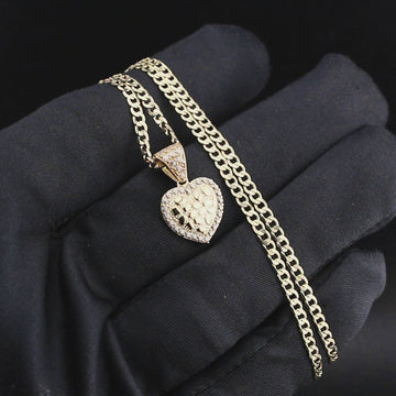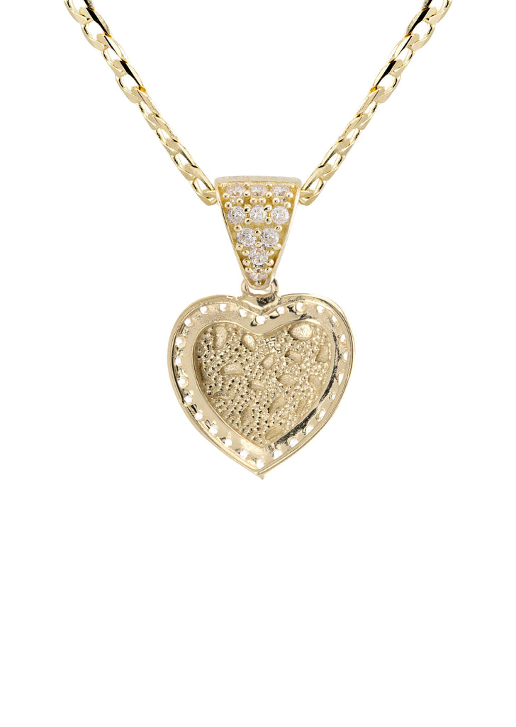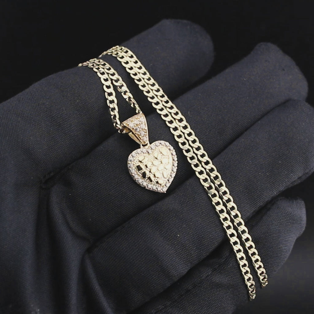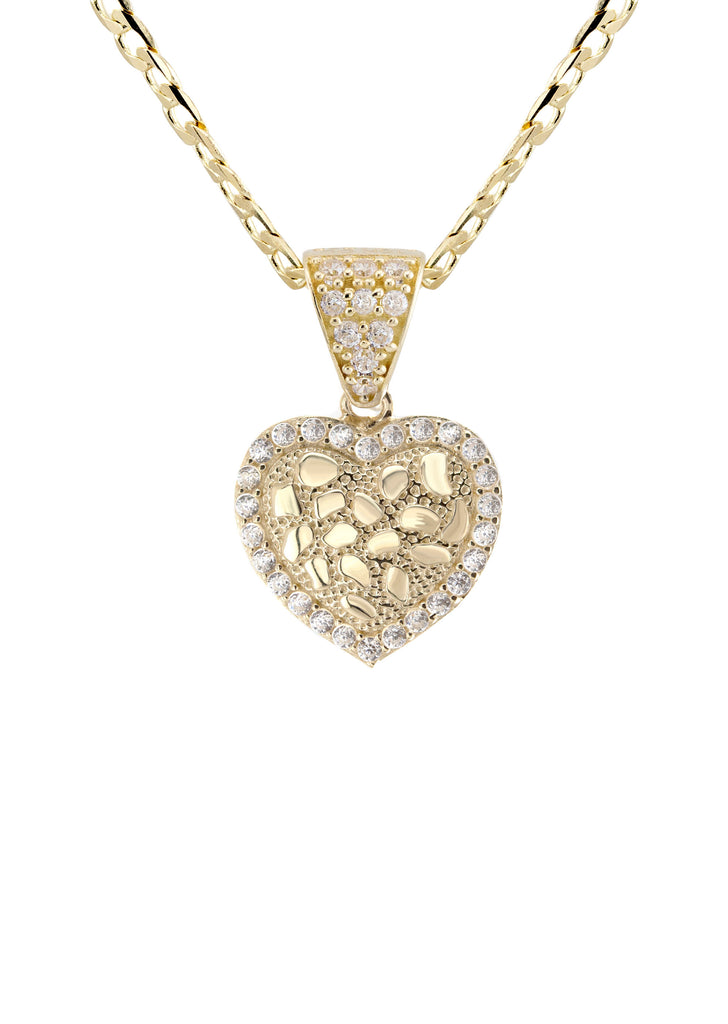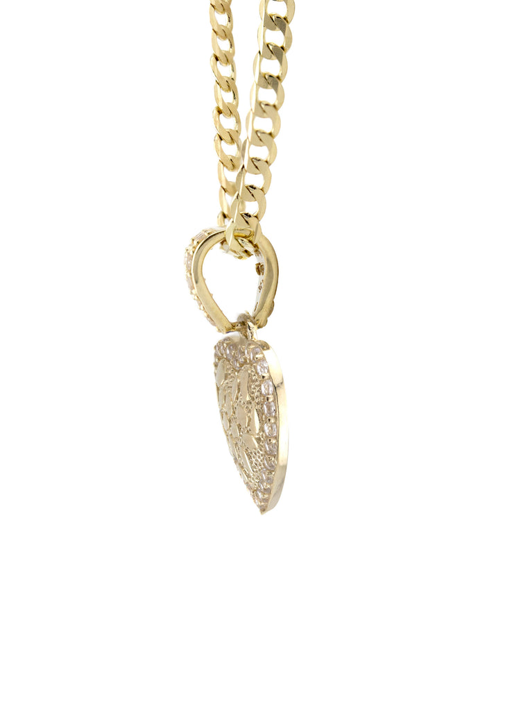 10K Yellow Gold Heart Nugget Necklace Encrusted With Cubic Zirconia Crystals With An Approximate Total Gram Weight Of 5.3. Pendant Weighs 1.3 Grams And The Chain Weighs 4 Grams. The Pendant Measurement Is 0.5 inches In Width And A Length Of 0.8 inches. The Length And Type Of The Chain Can Be Adjusted Or Select The No Chain Option.