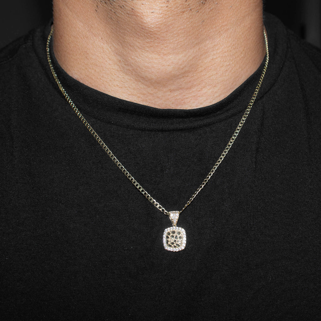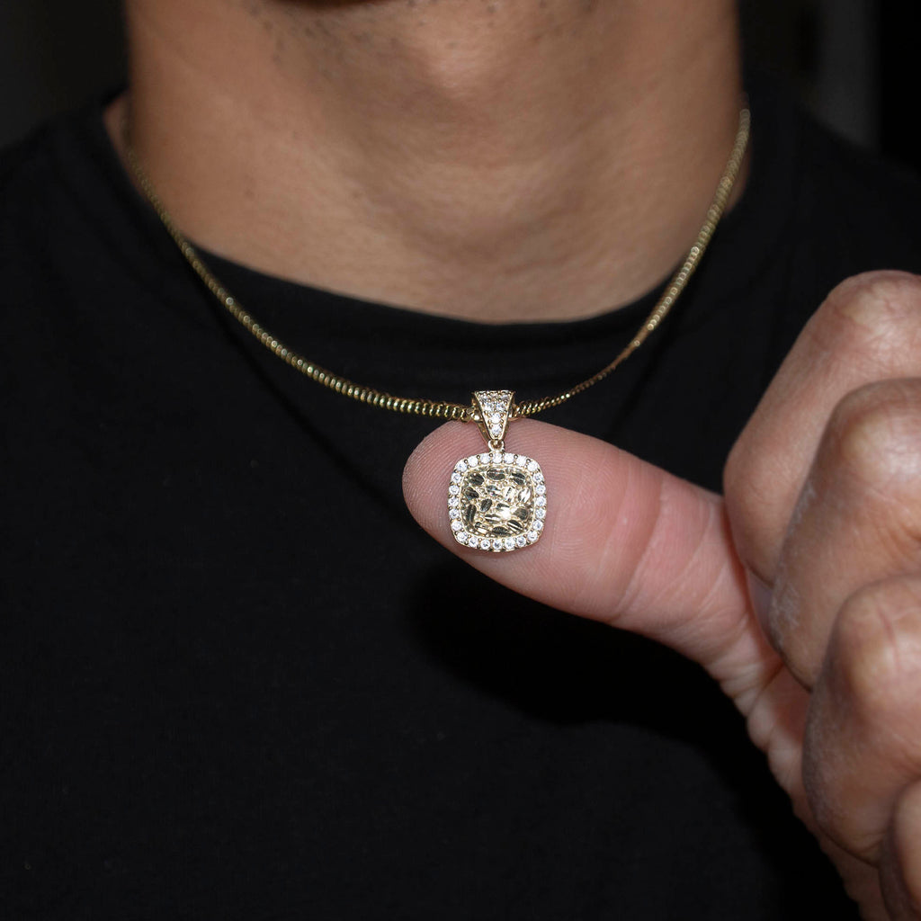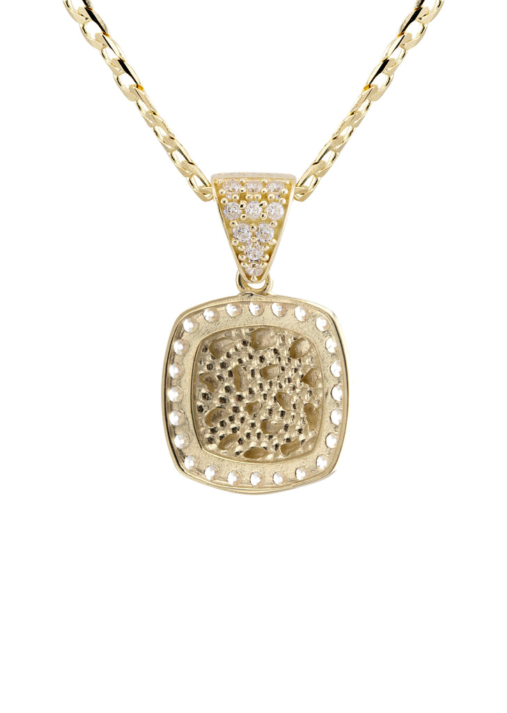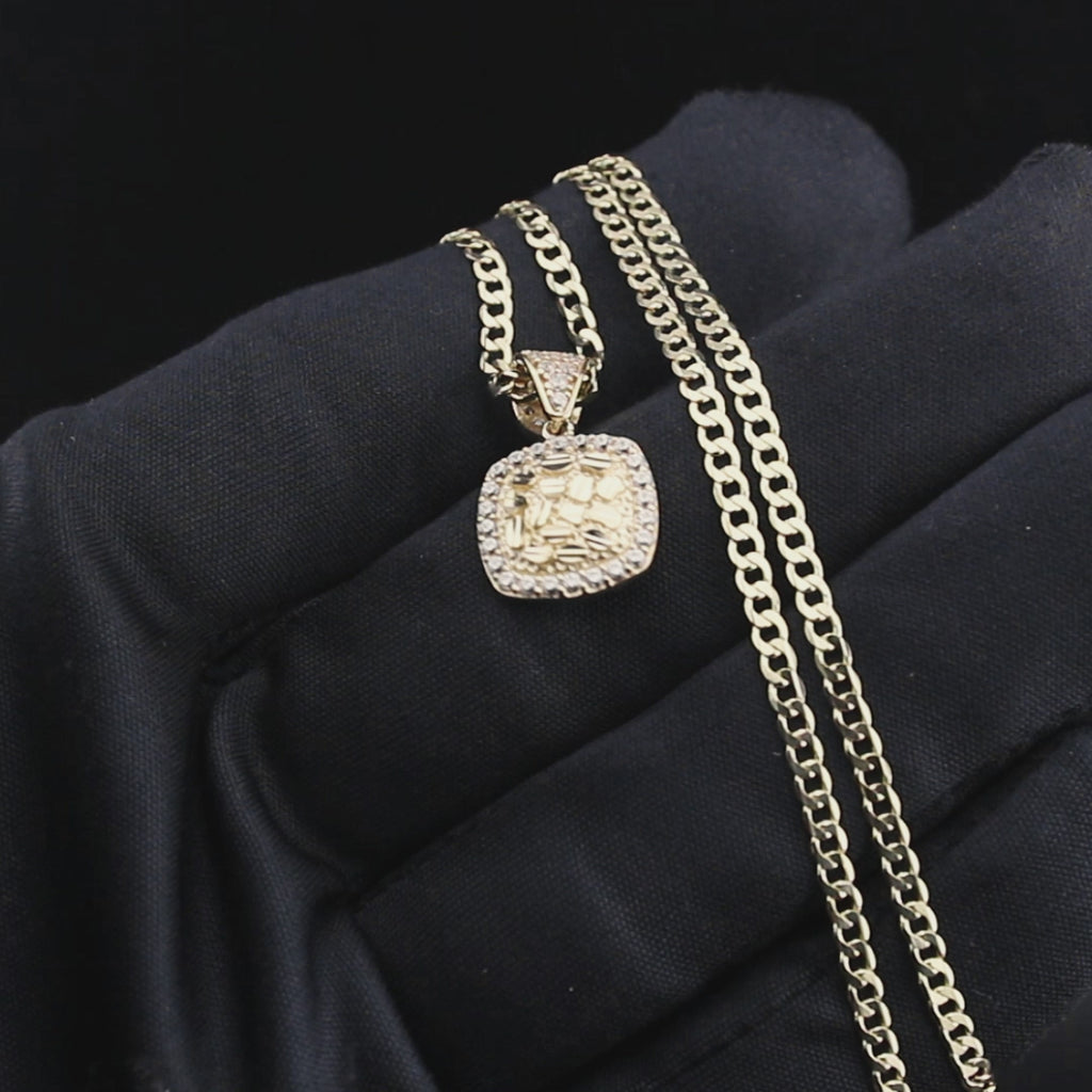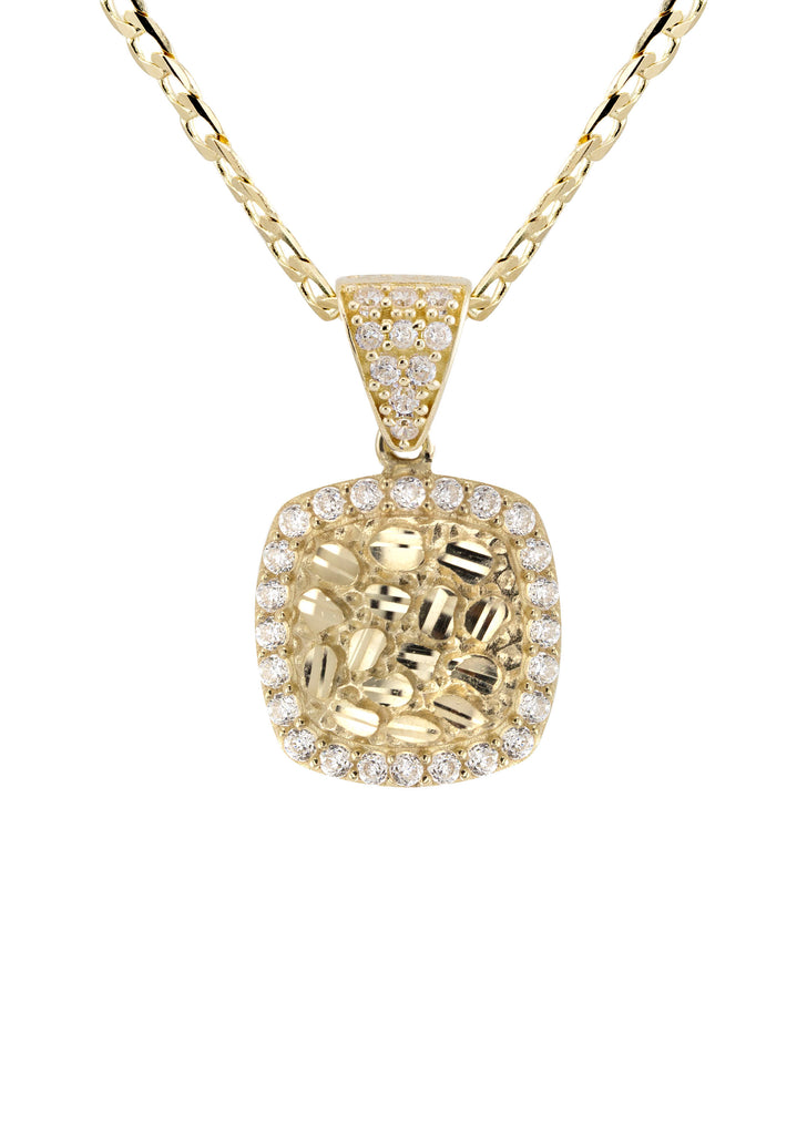 10K Yellow Gold Heart Nugget Necklace Encrusted With Cubic Zirconia Crystals With An Approximate Total Gram Weight Of 5.5. Pendant Weighs 1.5 Grams And The Chain Weighs 4 Grams. The Pendant Measurement Is 0.5 inches In Width And A Length Of 0.8 inches. The Length And Type Of The Chain Can Be Adjusted Or Select The No Chain Option.