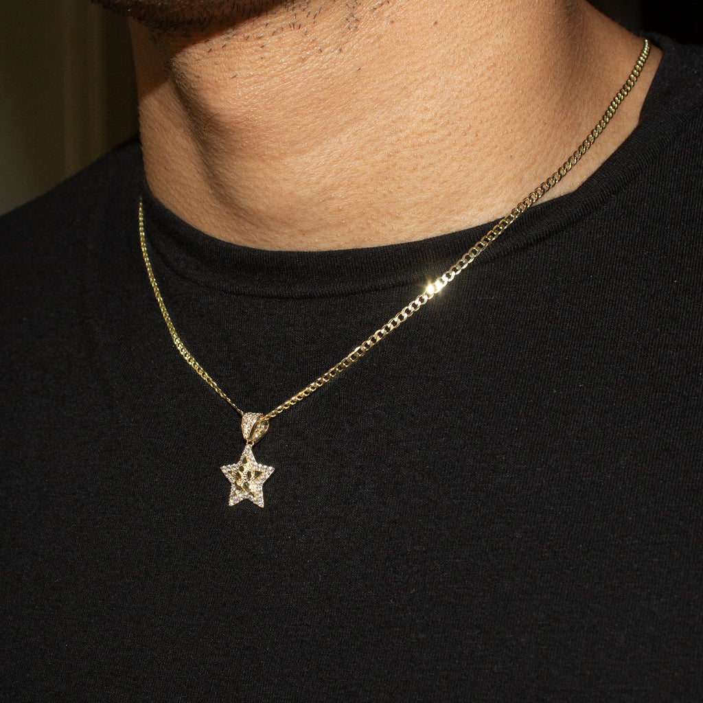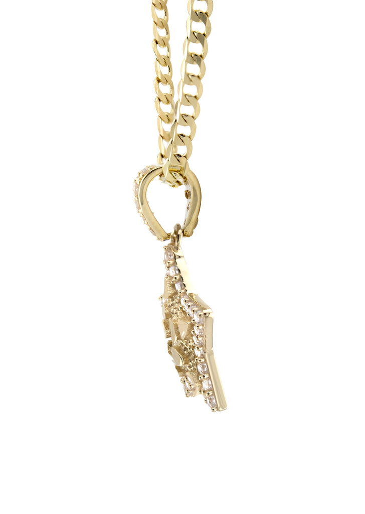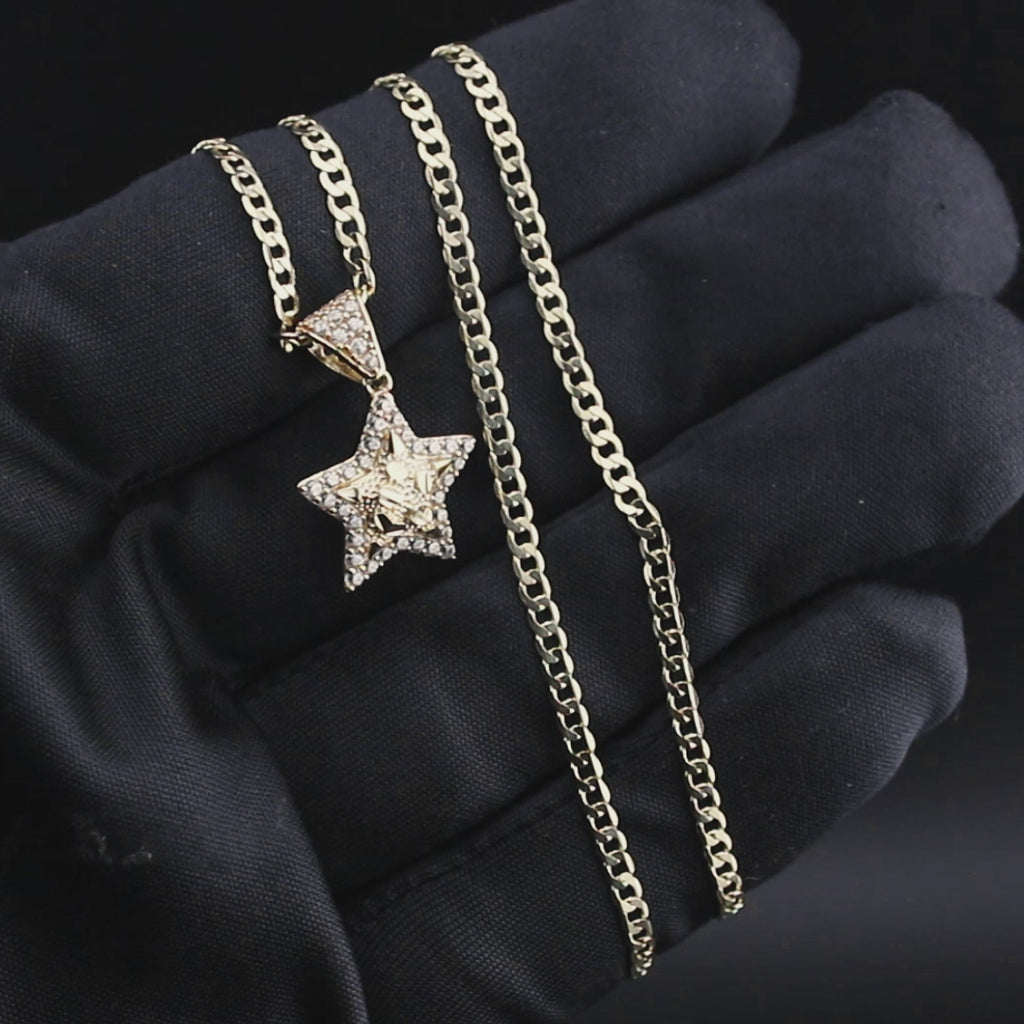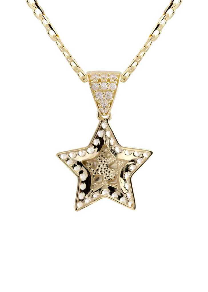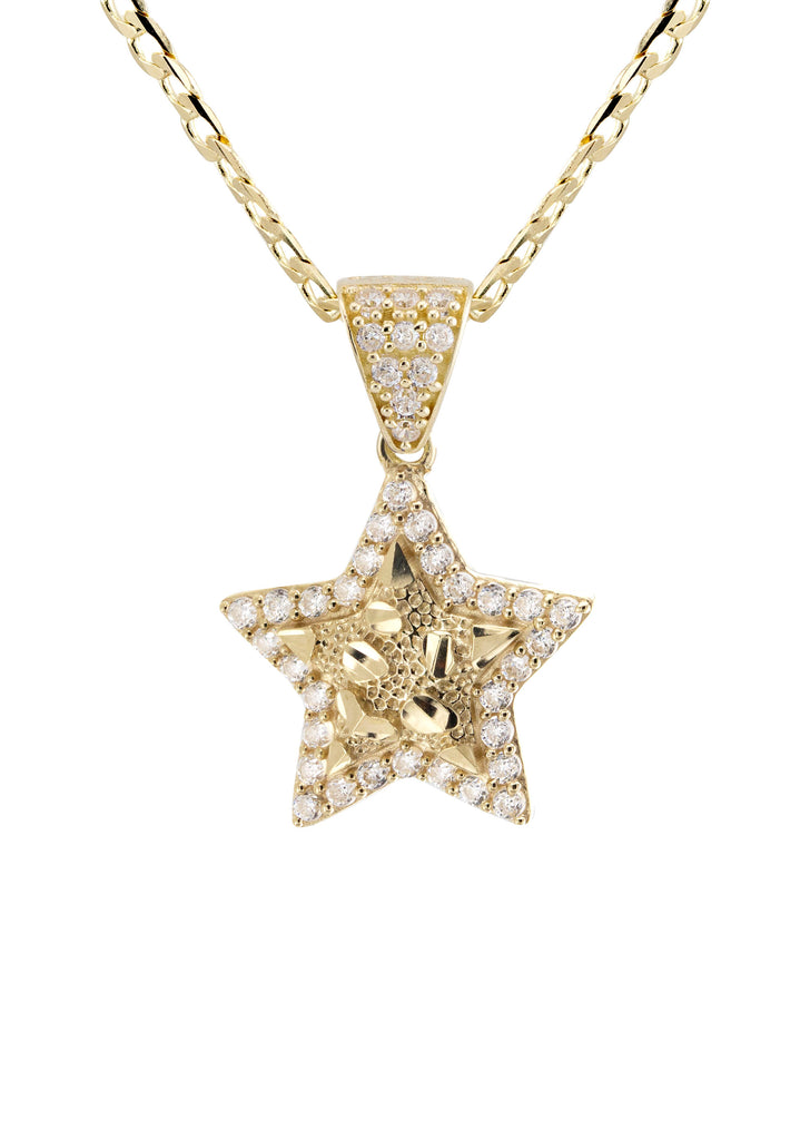 10K Yellow Gold Star Nugget Necklace Encrusted With Cubic Zirconia Crystals With An Approximate Total Gram Weight Of 5.6. Pendant Weighs 1.6 Grams And The Chain Weighs 4 Grams. The Pendant Measurement Is 0.6 inches In Width And A Length Of 0.9 inches. The Length And Type Of The Chain Can Be Adjusted Or Select The No Chain Option.