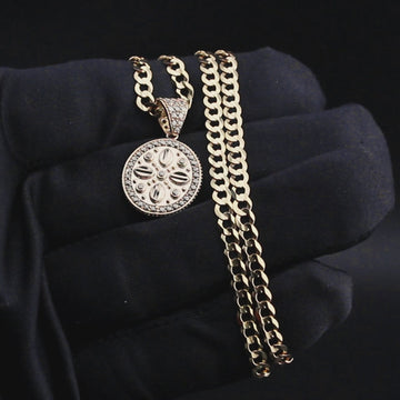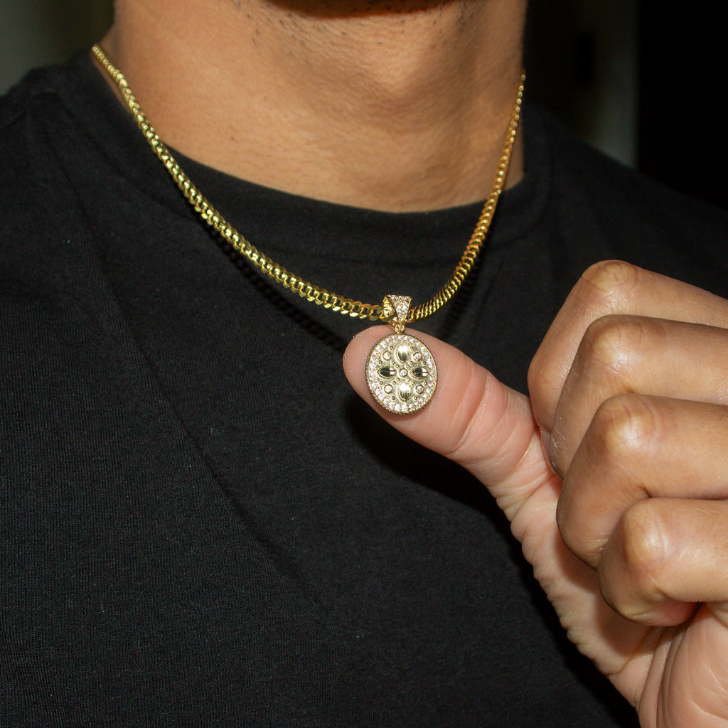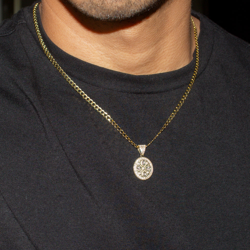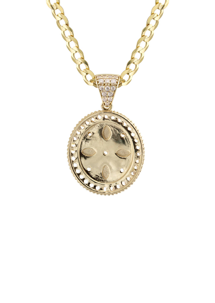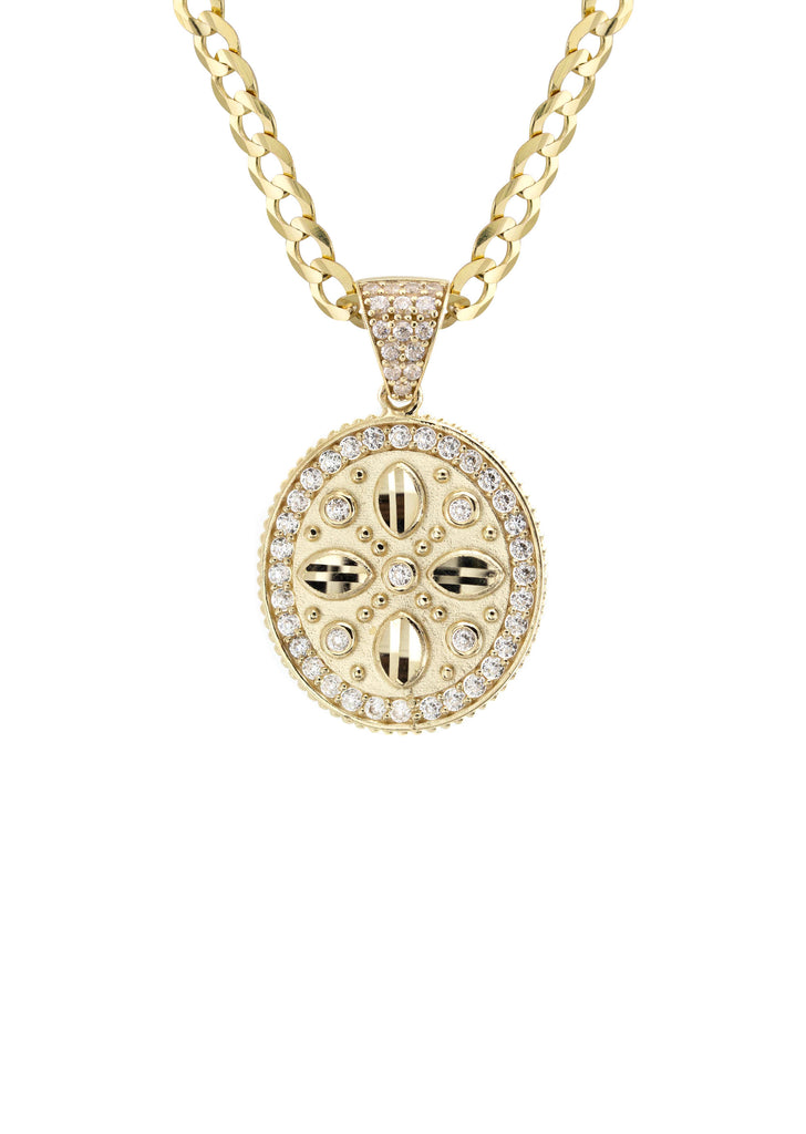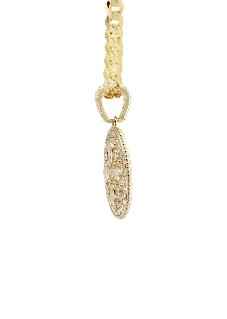 10K Yellow Gold Necklace Encrusted With Cubic Zirconia Crystals With An Approximate Total Gram Weight Of 9.4. Pendant Weighs 2.4 Grams And The Chain Weighs 7 Grams. The Pendant Measurement Is 0.6 inches In Width And A Length Of 1 inches. The Length And Type Of The Chain Can Be Adjusted Or Select The No Chain Option.