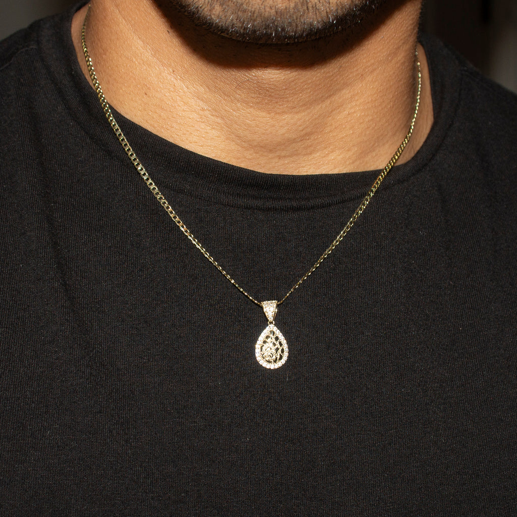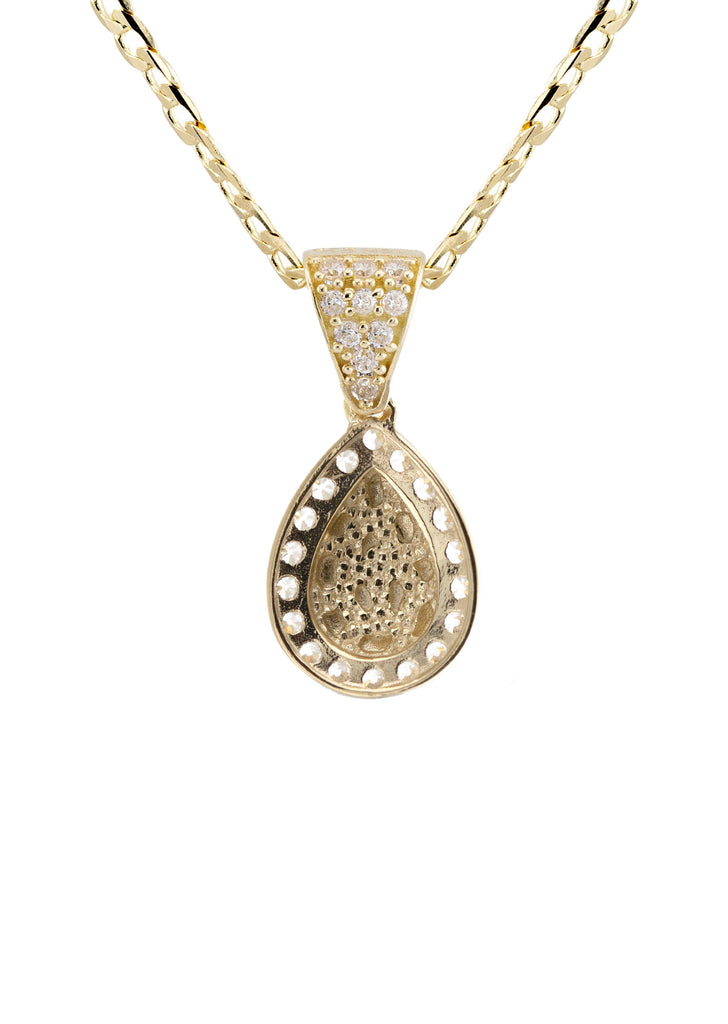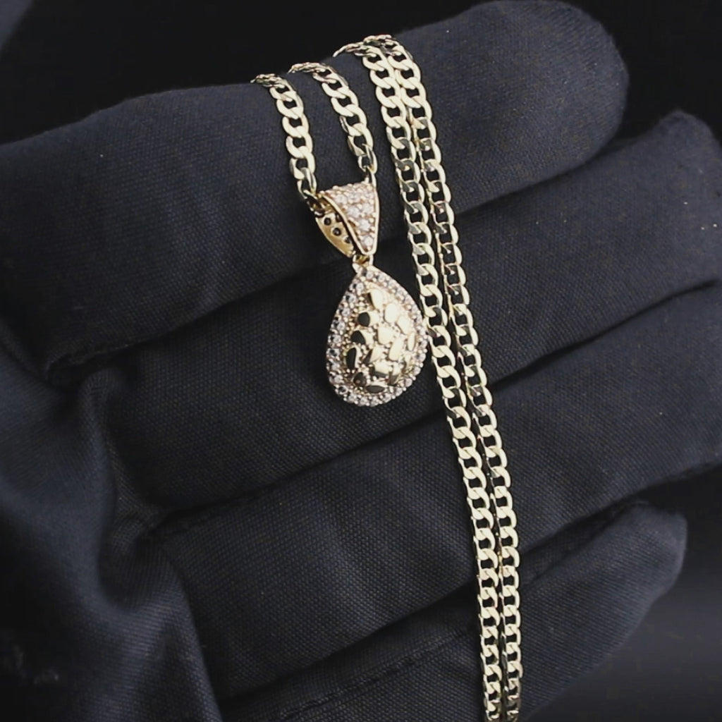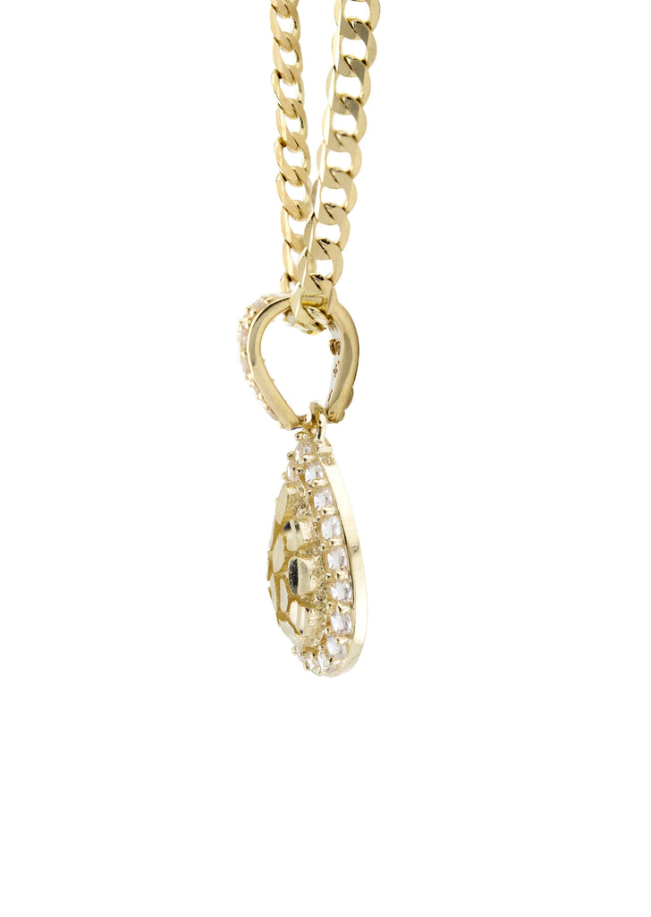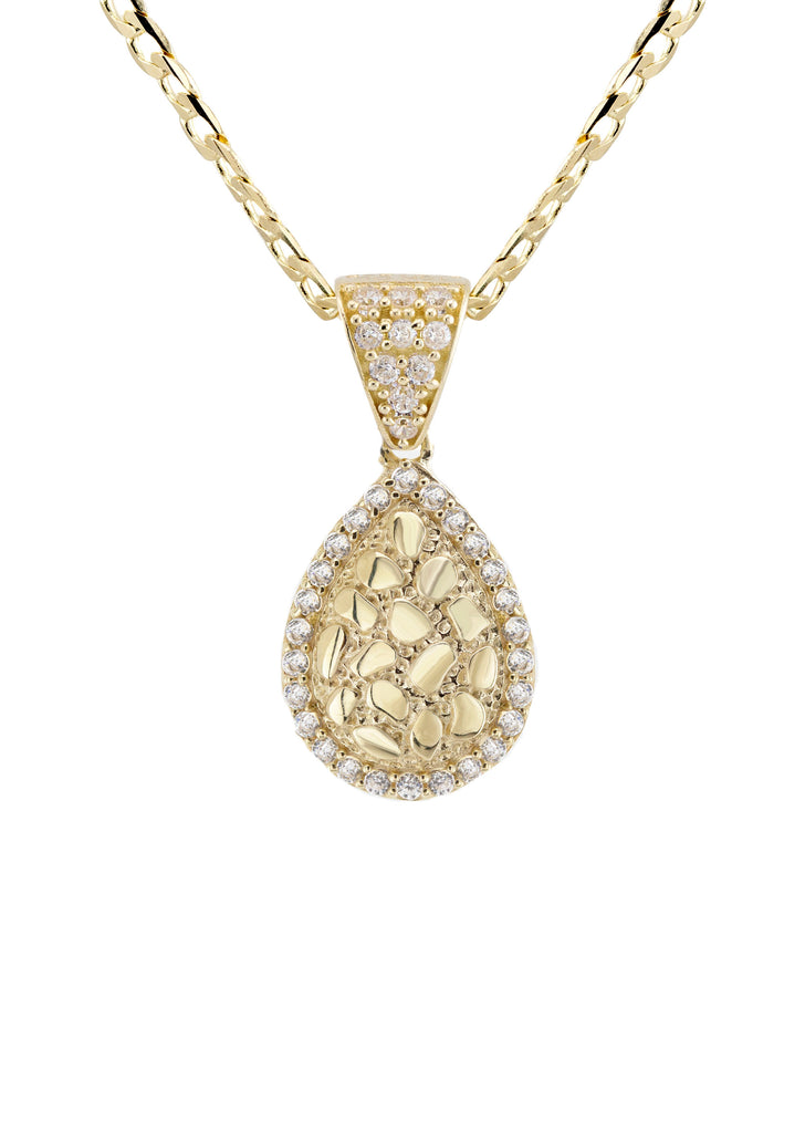 10K Yellow Gold Nugget Necklace Encrusted With Cubic Zirconia Crystals With An Approximate Total Gram Weight Of 5.2. Pendant Weighs 1.2 Grams And The Chain Weighs 4 Grams. The Pendant Measurement Is 0.4 inches In Width And A Length Of 0.8 inches. The Length And Type Of The Chain Can Be Adjusted Or Select The No Chain Option.