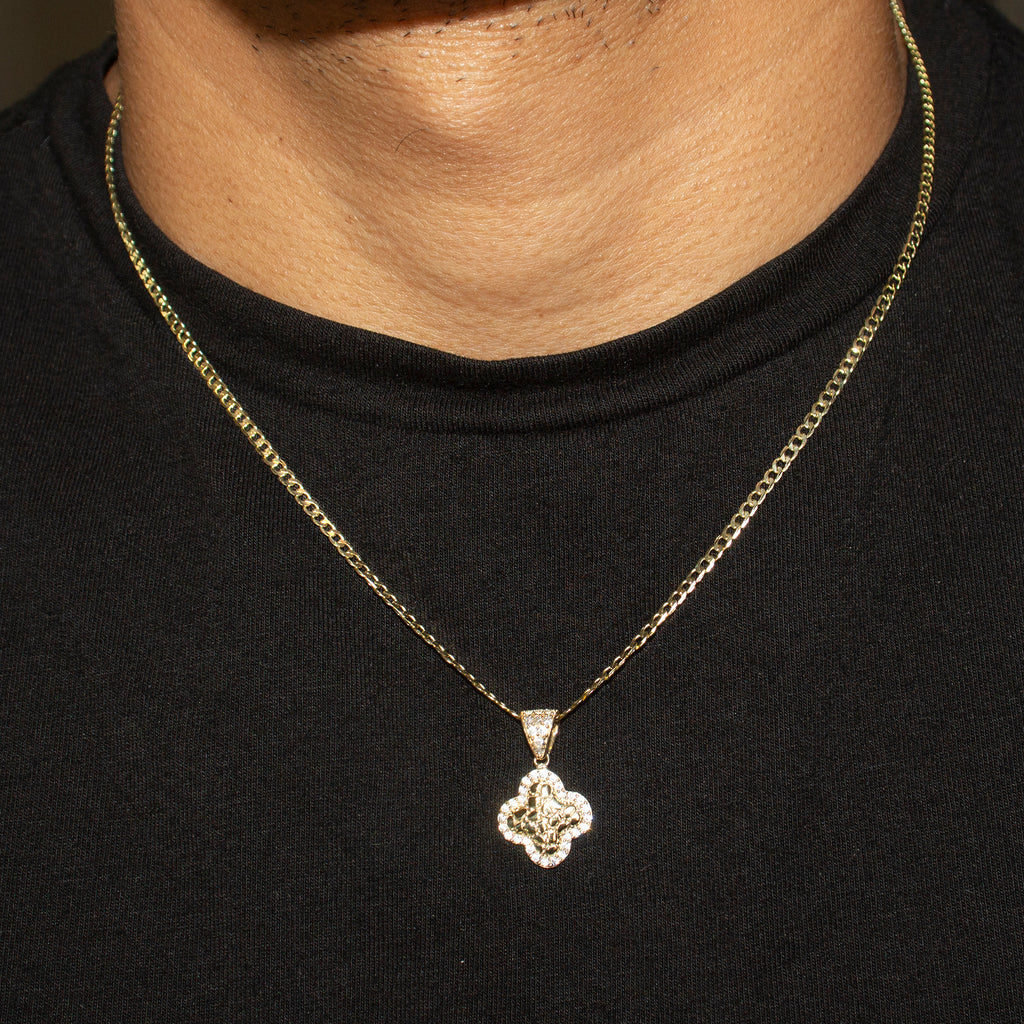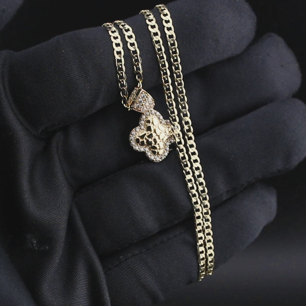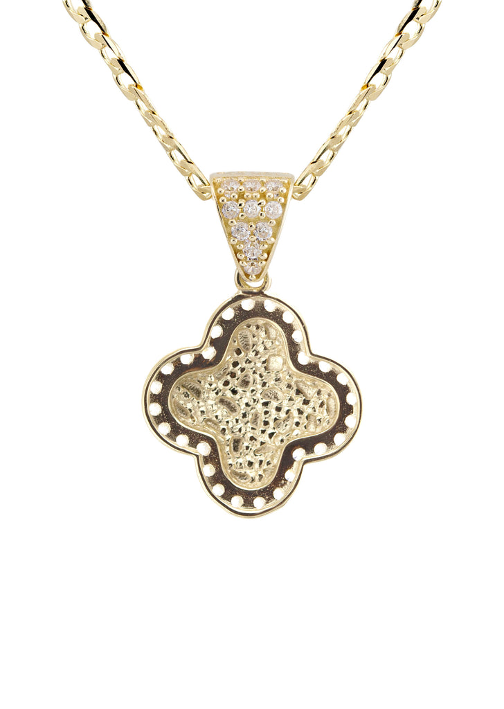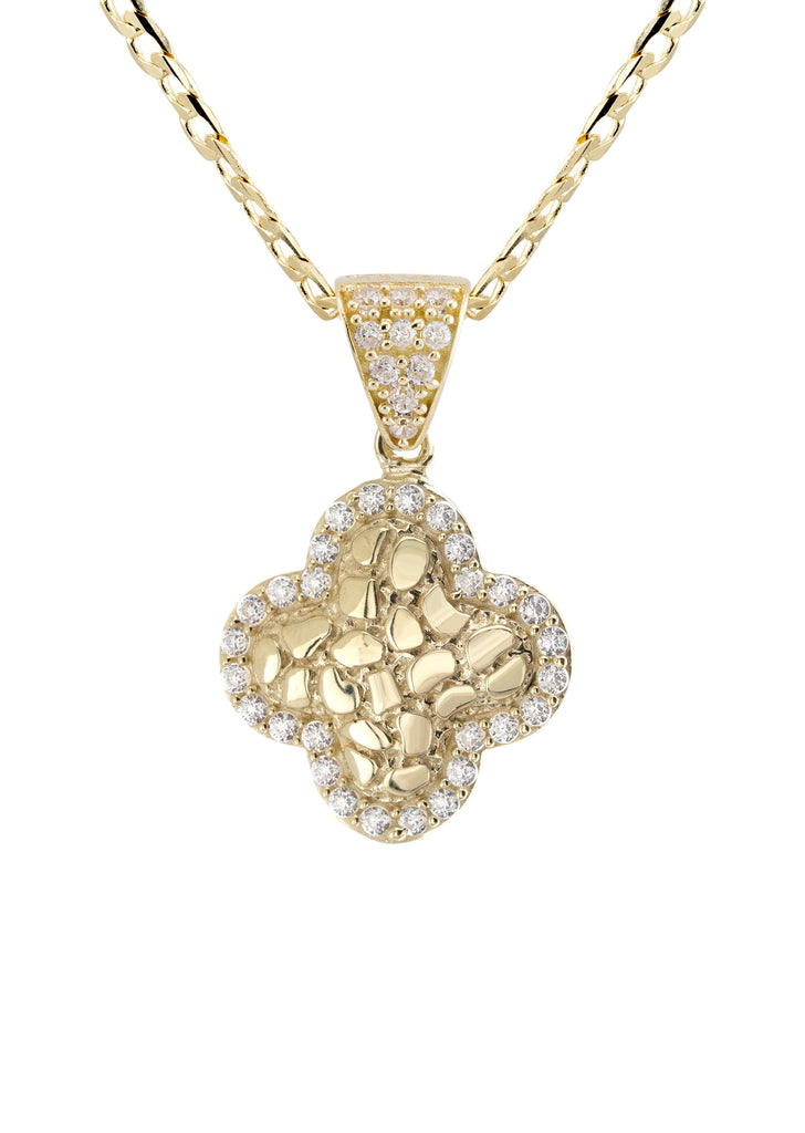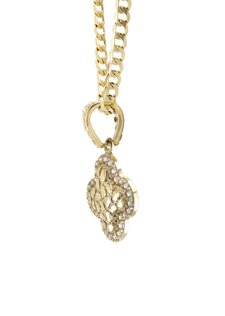 10K Yellow Gold Nugget Necklace Encrusted With Cubic Zirconia Crystals With An Approximate Total Gram Weight Of 5.4. Pendant Weighs 1.4 Grams And The Chain Weighs 4 Grams. The Pendant Measurement Is 0.5 inches In Width And A Length Of 0.9 inches. The Length And Type Of The Chain Can Be Adjusted Or Select The No Chain Option.