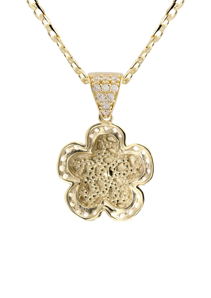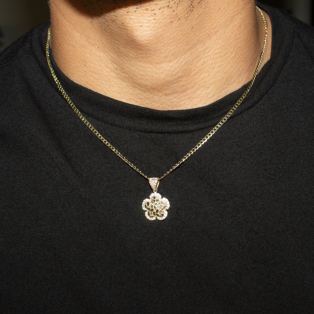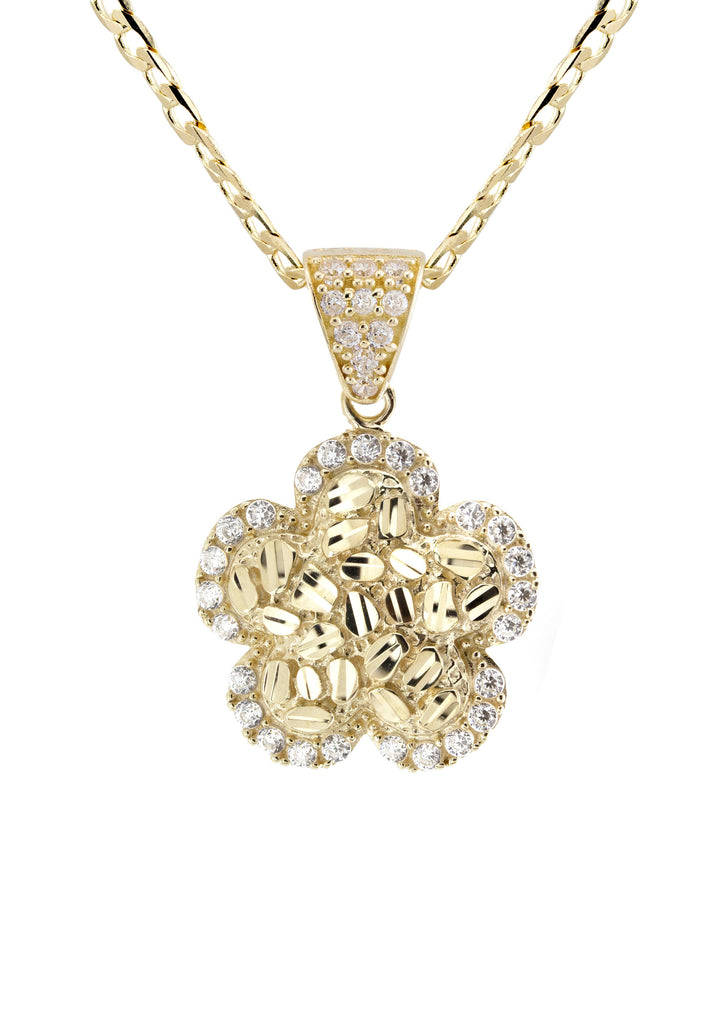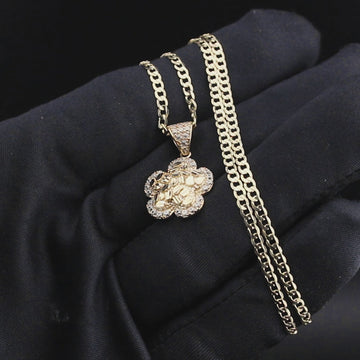 10K Yellow Gold Nugget Necklace Encrusted With Cubic Zirconia Crystals With An Approximate Total Gram Weight Of 6. Pendant Weighs 2 Grams And The Chain Weighs 4 Grams. The Pendant Measurement Is 0.6 inches In Width And A Length Of 1 inches. The Length And Type Of The Chain Can Be Adjusted Or Select The No Chain Option.