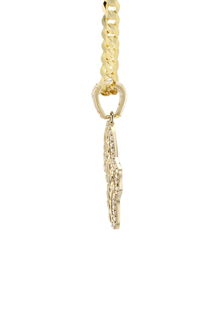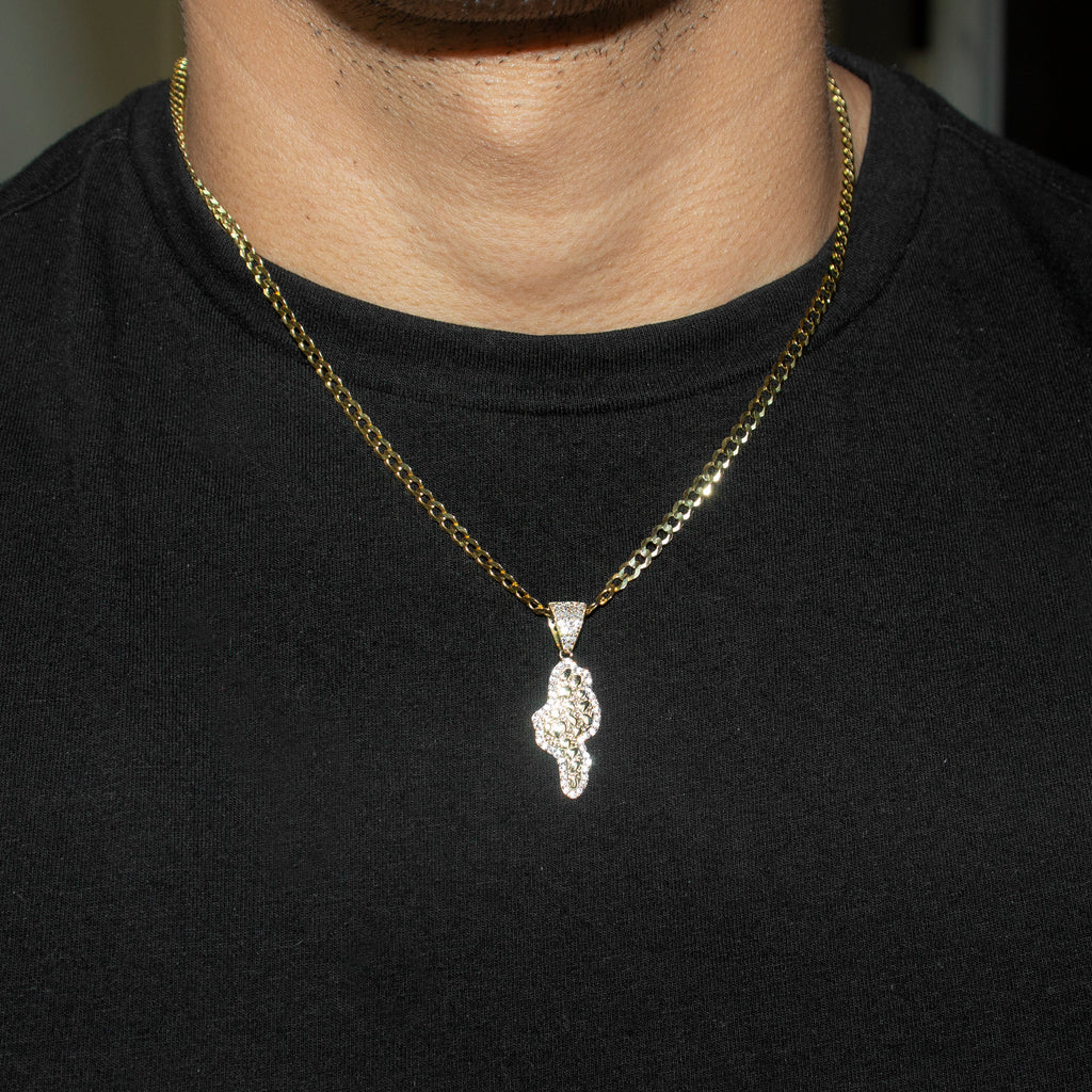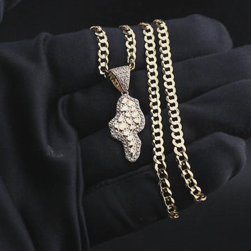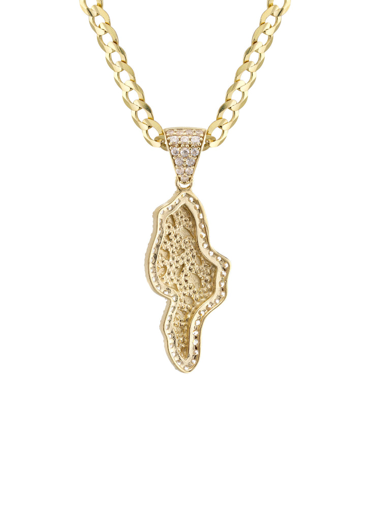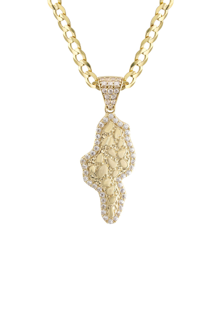 10K Yellow Gold Nugget Necklace Encrusted With Cubic Zirconia Crystals With An Approximate Total Gram Weight Of 9.5. Pendant Weighs 2.2 Grams And The Chain Weighs 7 Grams. The Pendant Measurement Is 0.5 inches In Width And A Length Of 1.4 inches. The Length And Type Of The Chain Can Be Adjusted Or Select The No Chain Option.