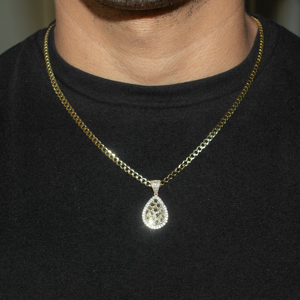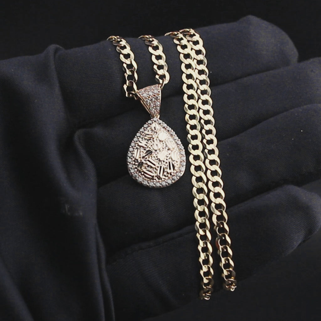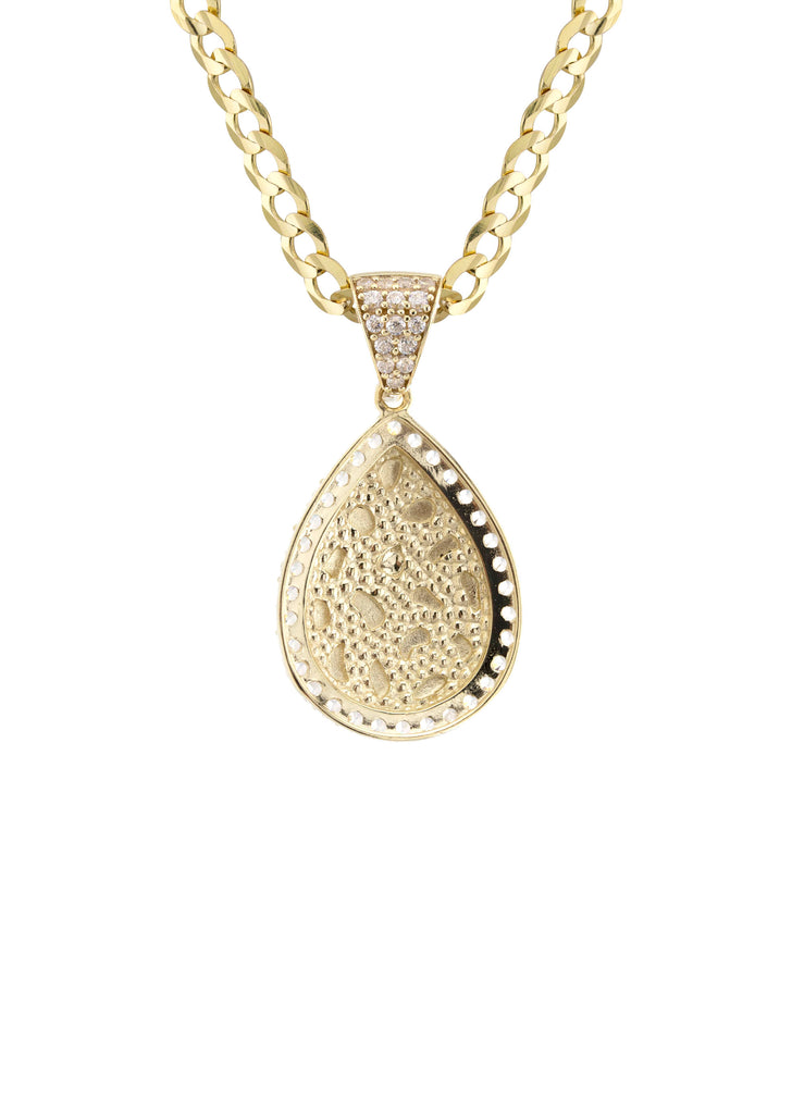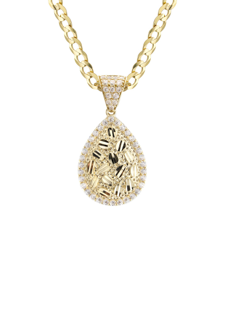 10K Yellow Gold Nugget Necklace Encrusted With Cubic Zirconia Crystals With An Approximate Total Gram Weight Of 9.3. Pendant Weighs 2.3 Grams And The Chain Weighs 7 Grams. The Pendant Measurement Is 0.6 inches In Width And A Length Of 1.1 inches. The Length And Type Of The Chain Can Be Adjusted Or Select The No Chain Option.