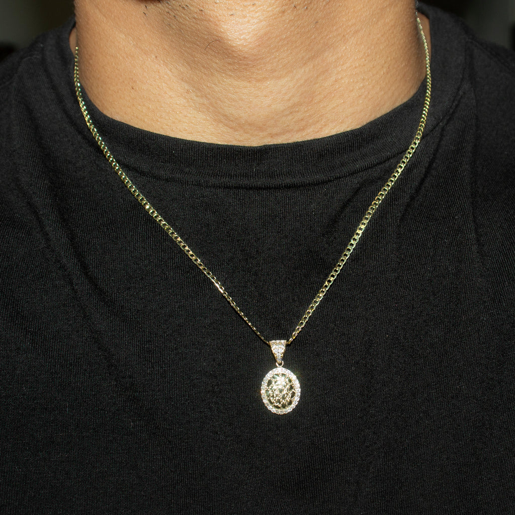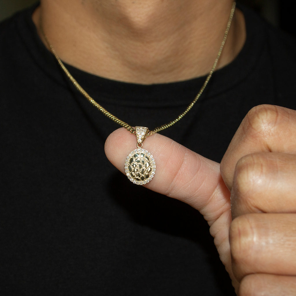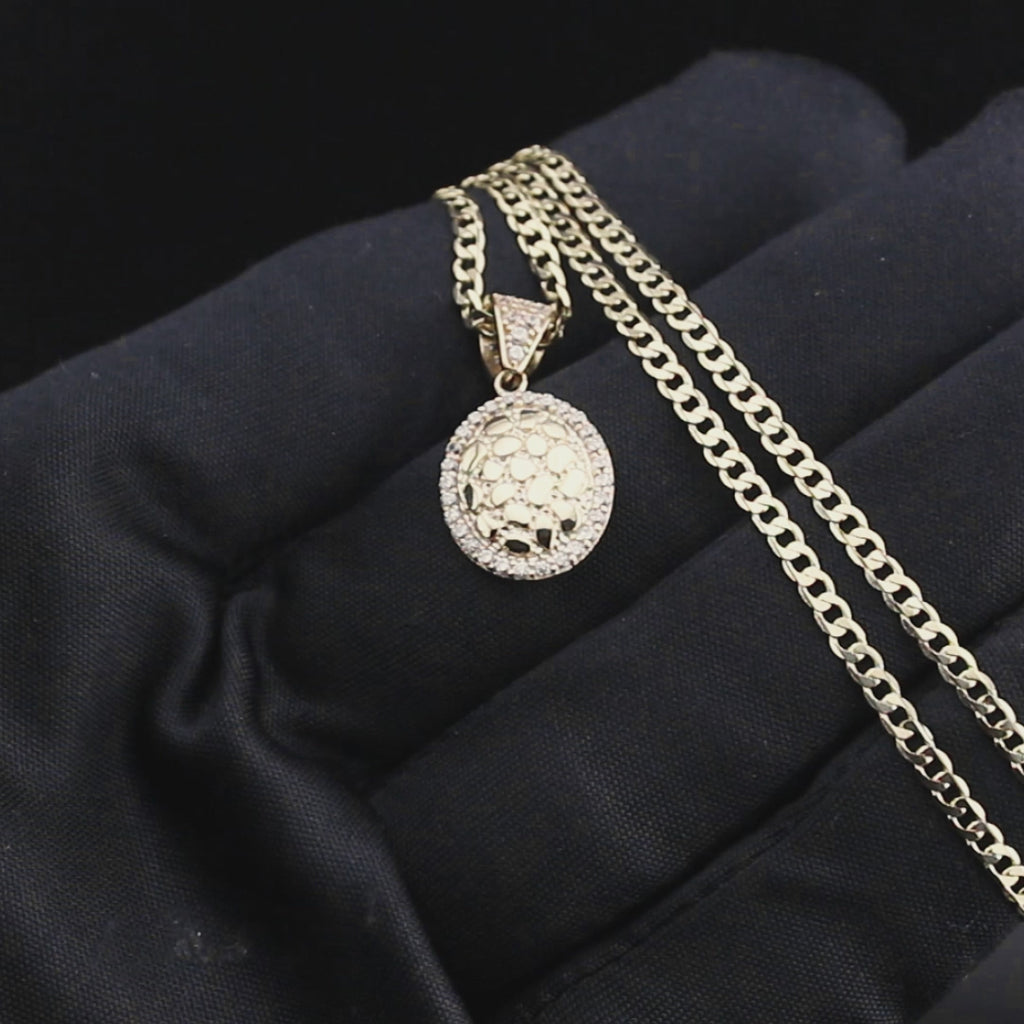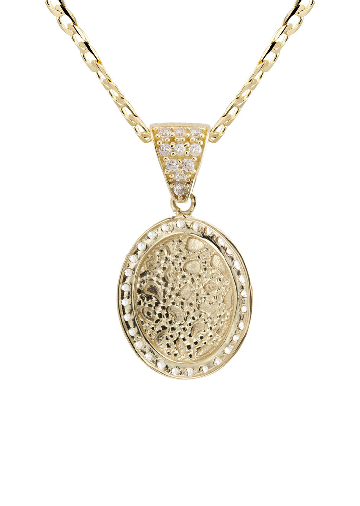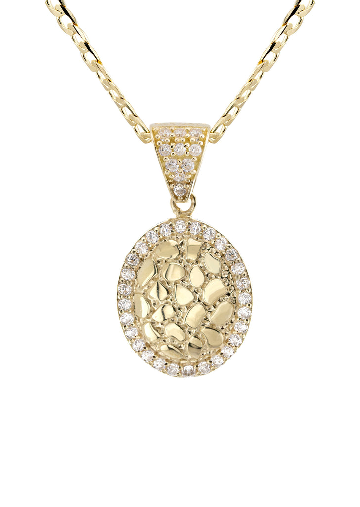 10K Yellow Gold Oval Nugget Necklace Encrusted With Cubic Zirconia Crystals With An Approximate Total Gram Weight Of 5.5. Pendant Weighs 1.5 Grams And The Chain Weighs 4 Grams. The Pendant Measurement Is 0.6 inches In Width And A Length Of 0.9 inches. The Length And Type Of The Chain Can Be Adjusted Or Select The No Chain Option.