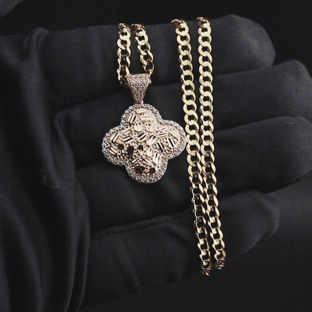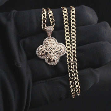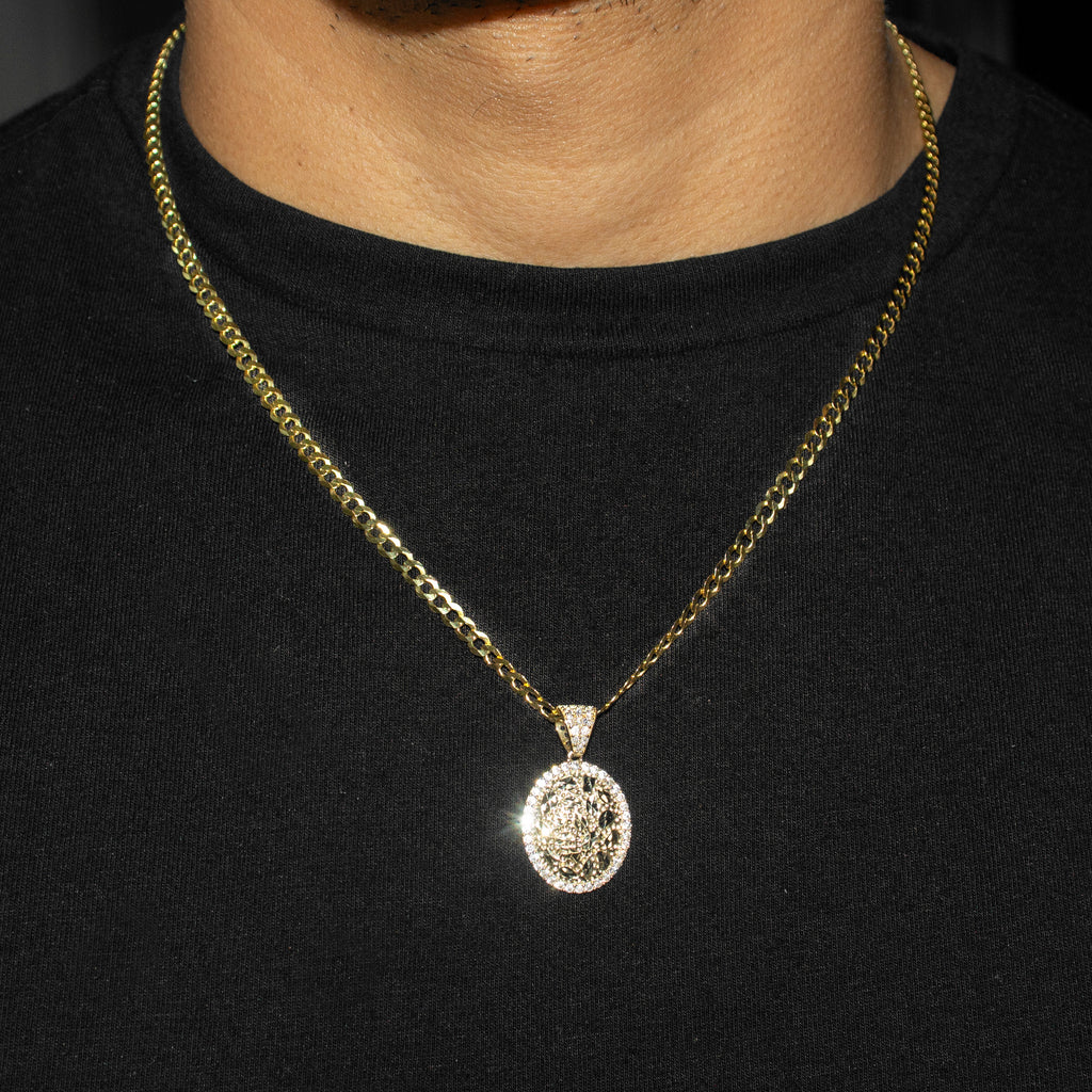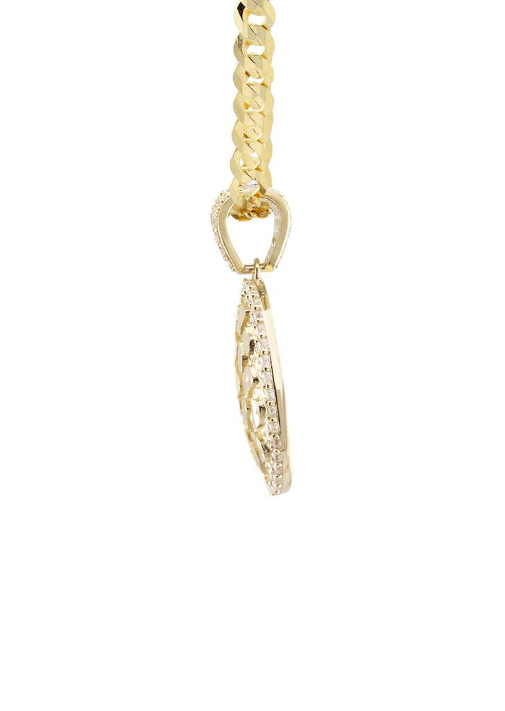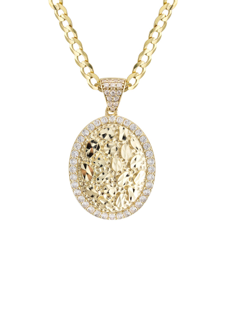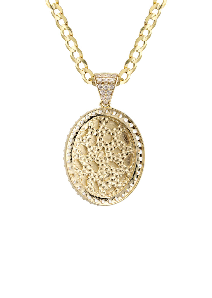 10K Yellow Gold Oval Nugget Necklace Encrusted With Cubic Zirconia Crystals With An Approximate Total Gram Weight Of 9.4. Pendant Weighs 2.4 Grams And The Chain Weighs 7 Grams. The Pendant Measurement Is 0.7 inches In Width And A Length Of 1.1 inches. The Length And Type Of The Chain Can Be Adjusted Or Select The No Chain Option.