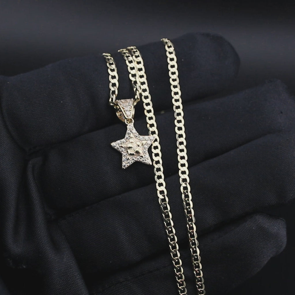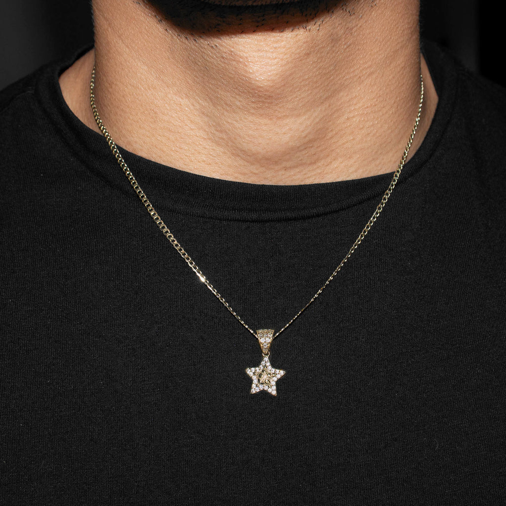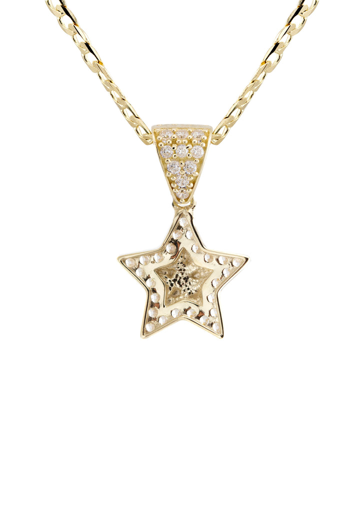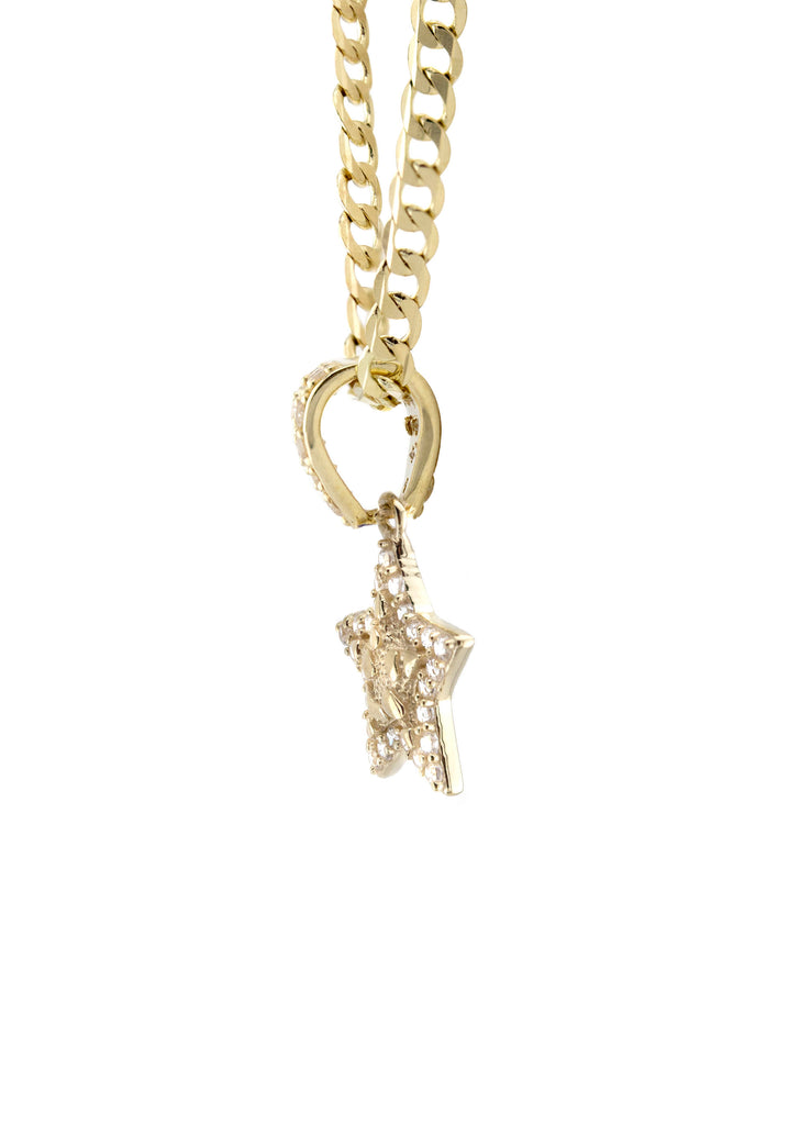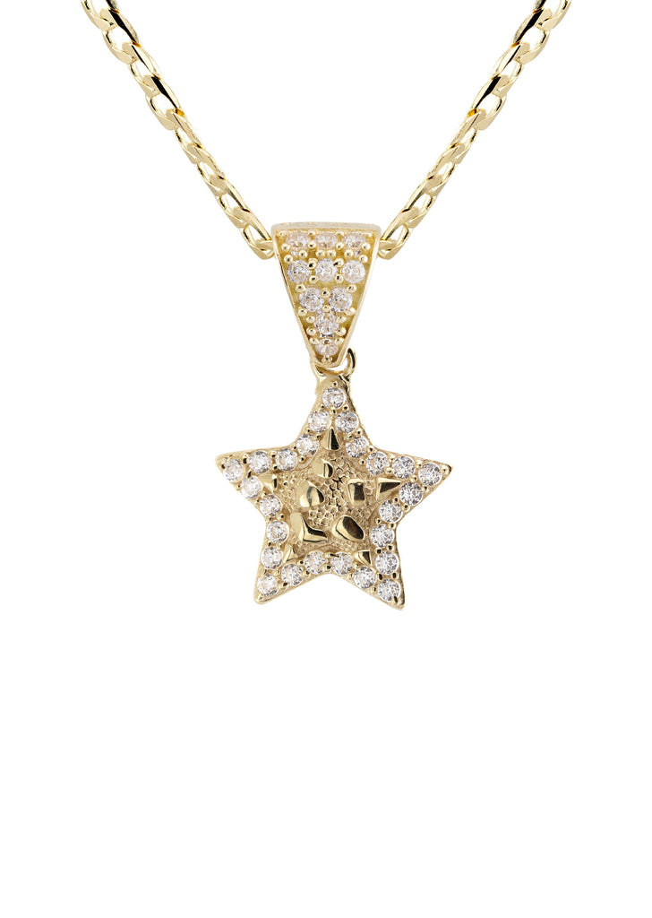 10K Yellow Gold Star Nugget Necklace Encrusted With Cubic Zirconia Crystals With An Approximate Total Gram Weight Of 5. Pendant Weighs 1 Grams And The Chain Weighs 4 Grams. The Pendant Measurement Is 0.5 inches In Width And A Length Of 0.8 inches. The Length And Type Of The Chain Can Be Adjusted Or Select The No Chain Option.
