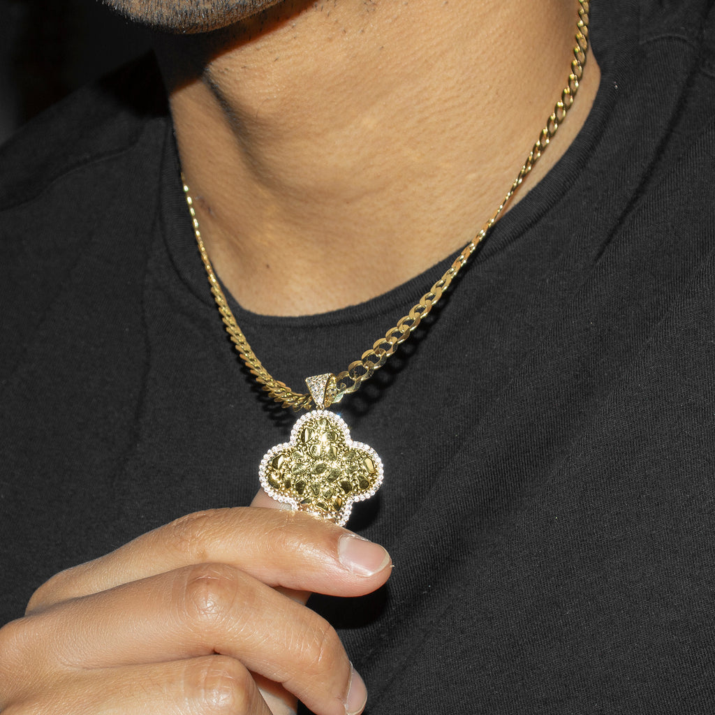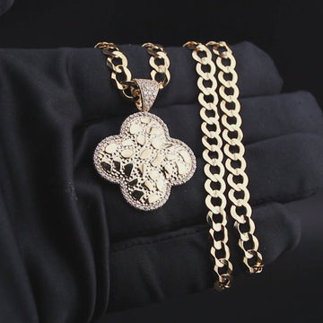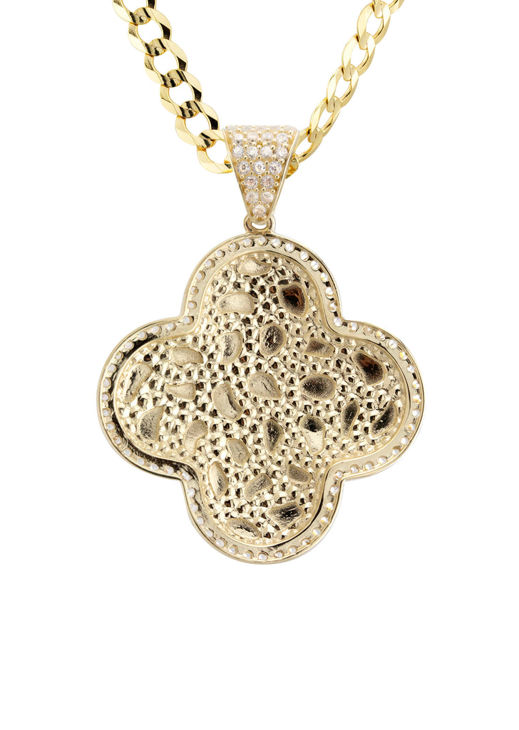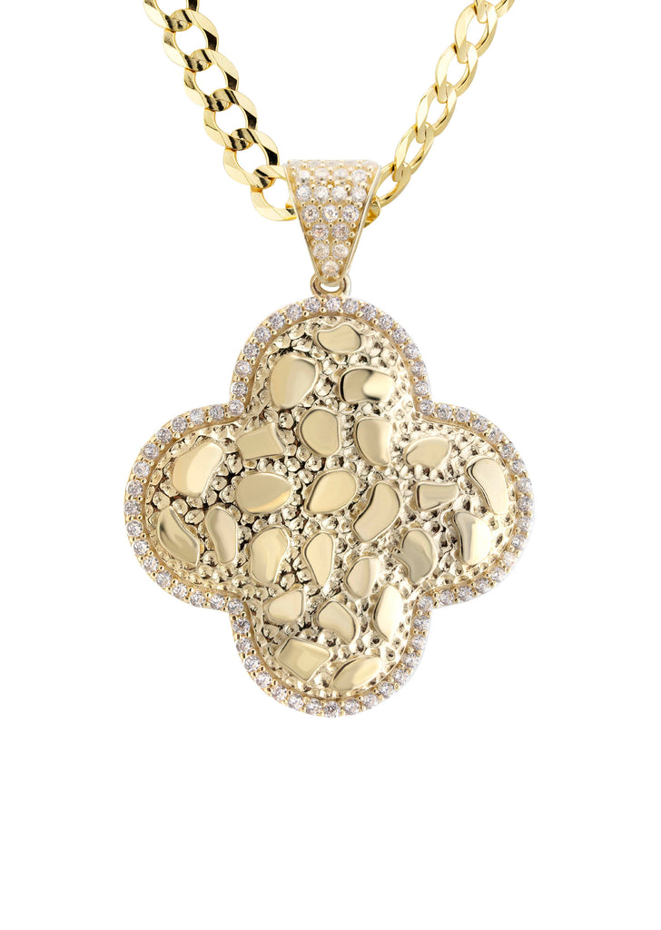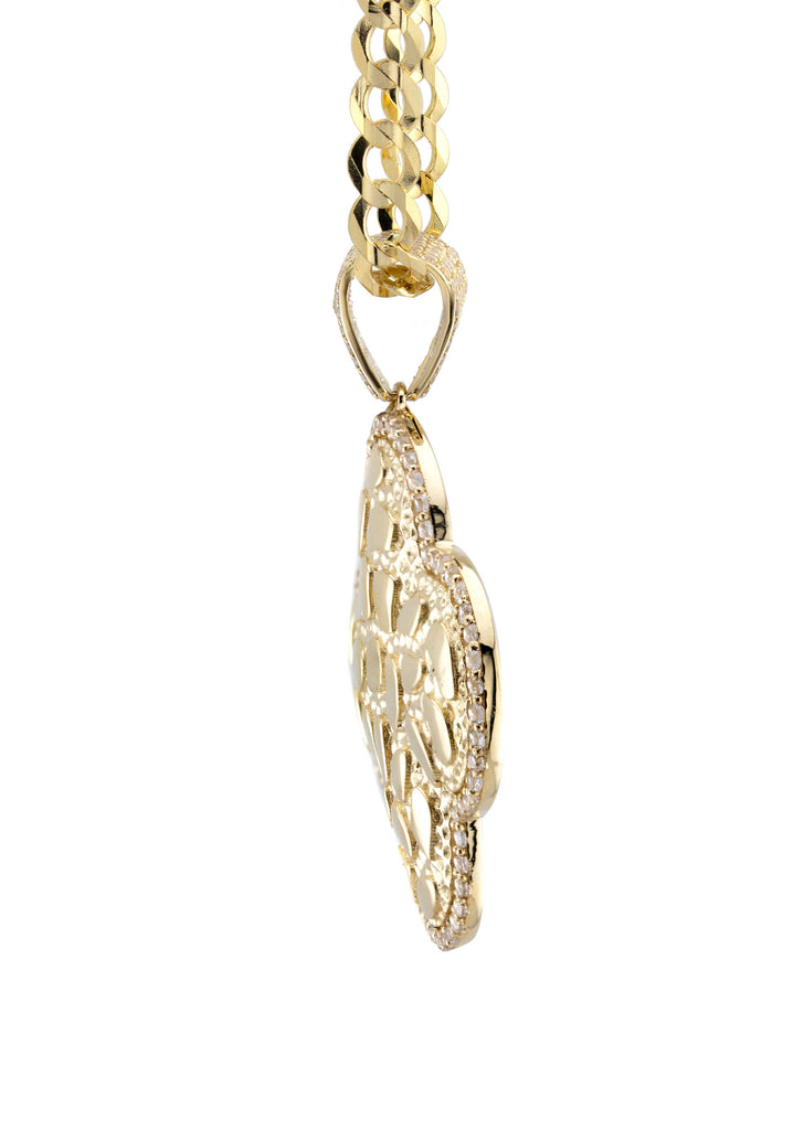 10K Yellow Gold Nugget Necklace Encrusted With Cubic Zirconia Crystals With An Approximate Total Gram Weight Of 18.5. Pendant Weighs 4.5 Grams And The Chain Weighs 14 Grams. The Pendant Measurement Is 1 inches In Width And A Length Of 1.4 inches. The Length And Type Of The Chain Can Be Adjusted Or Select The No Chain Option.