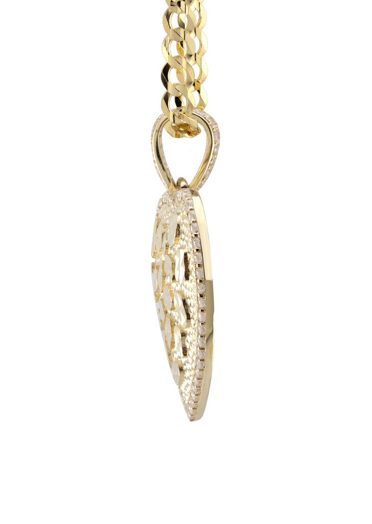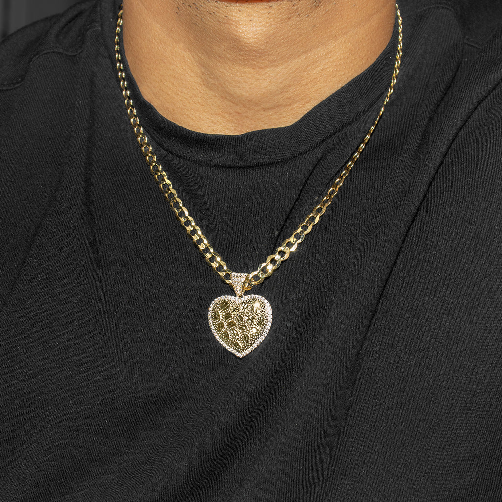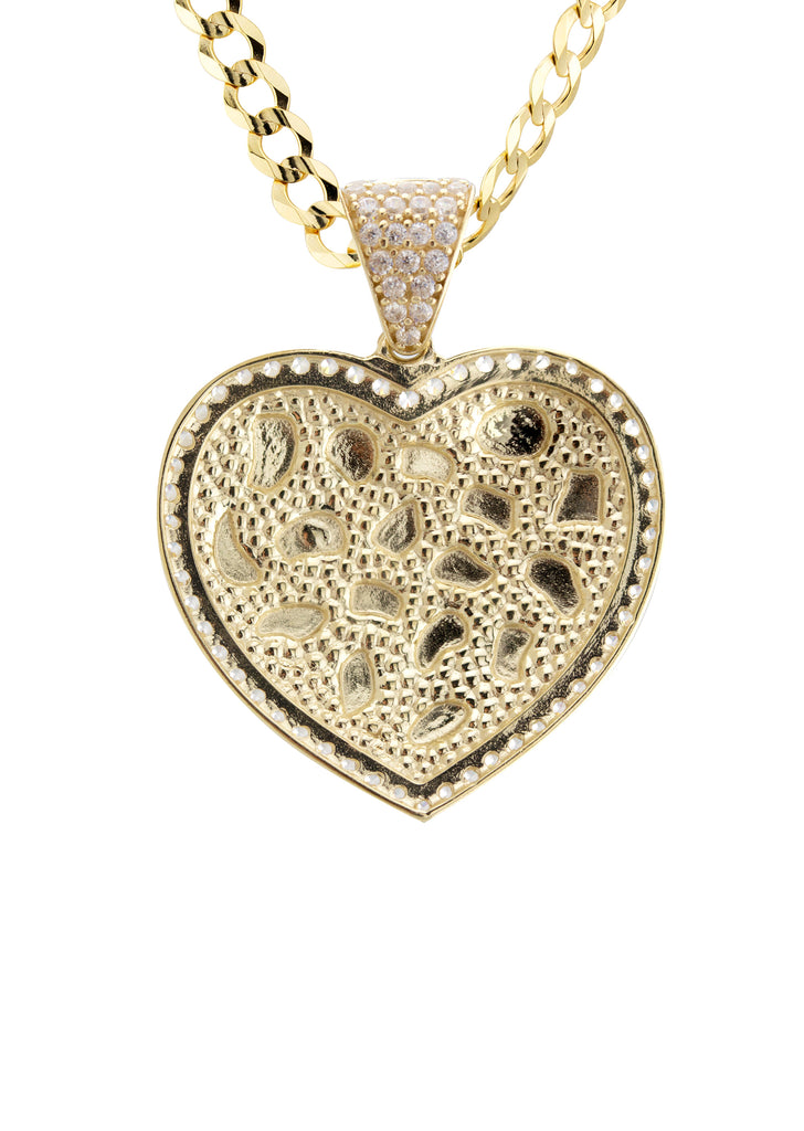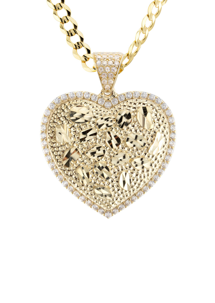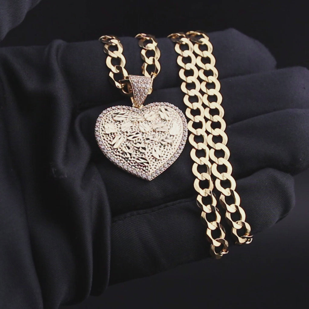 10K Yellow Gold Heart Nugget Necklace Encrusted With Cubic Zirconia Crystals With An Approximate Total Gram Weight Of 18.5. Pendant Weighs 4.5 Grams And The Chain Weighs 14 Grams. The Pendant Measurement Is 1 inches In Width And A Length Of 1.4 inches. The Length And Type Of The Chain Can Be Adjusted Or Select The No Chain Option.