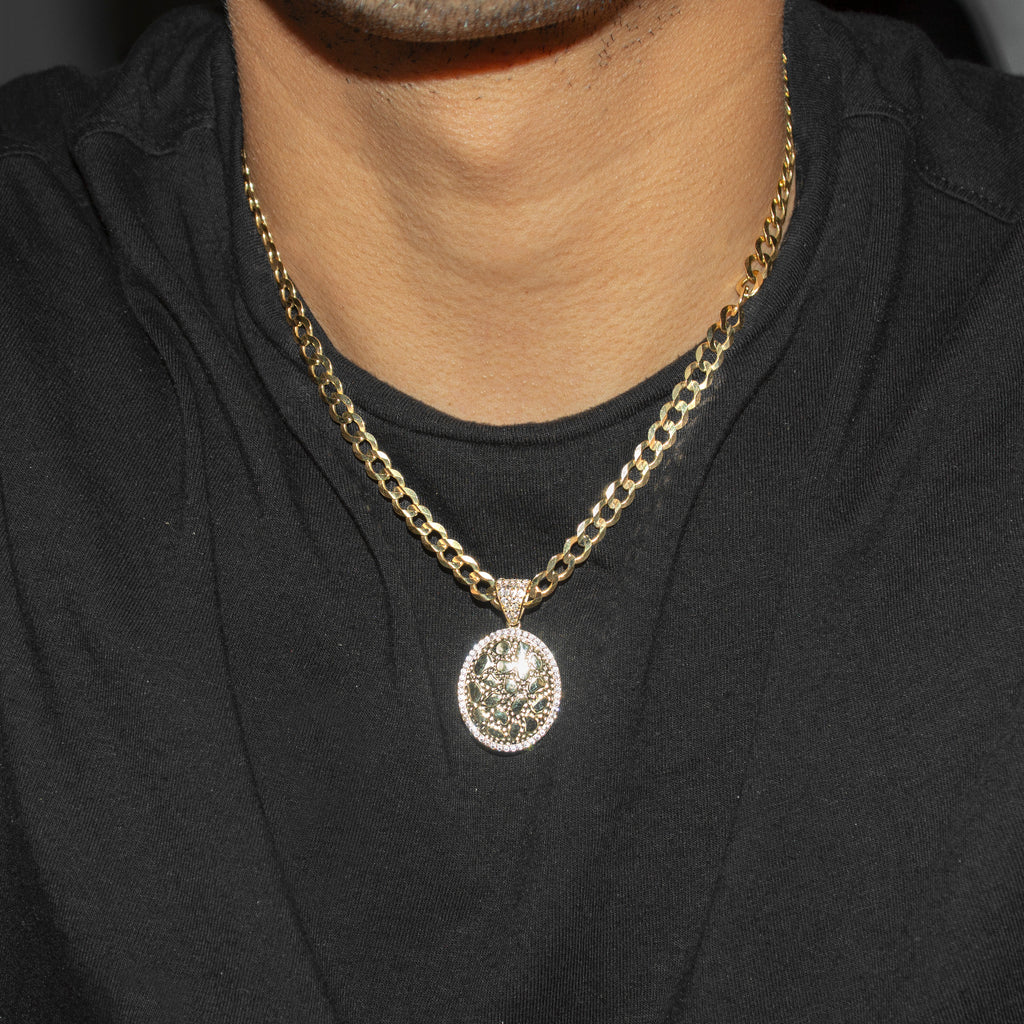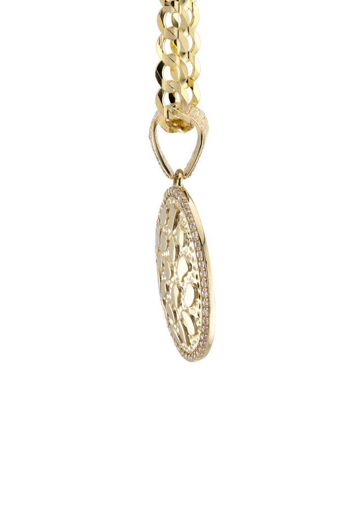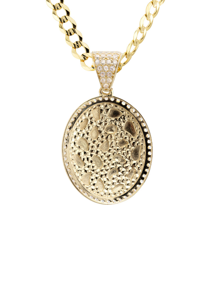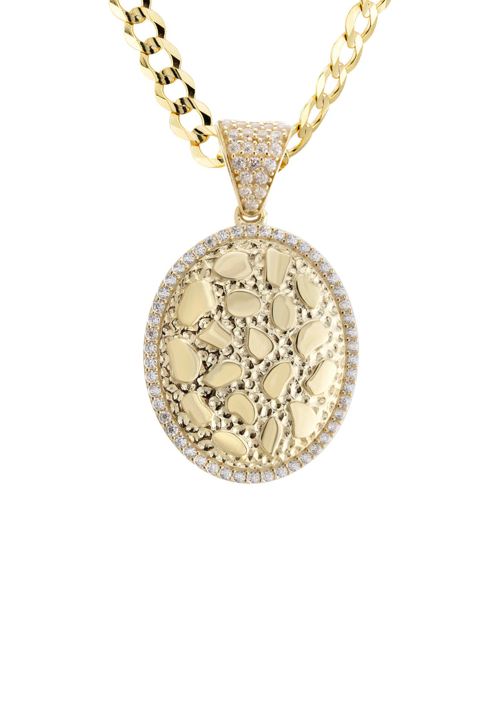 10K Yellow Gold Oval Nugget Necklace Encrusted With Cubic Zirconia With An Approximate Total Gram Weight Of 17.3. Pendant Weighs 3.3 Grams And The Chain Weighs 14 Grams. The Pendant Measurement Is 0.8 inches In Width And A Length Of 1.4 inches. The Length And Type Of The Chain Can Be Adjusted Or Select The No Chain Option.
