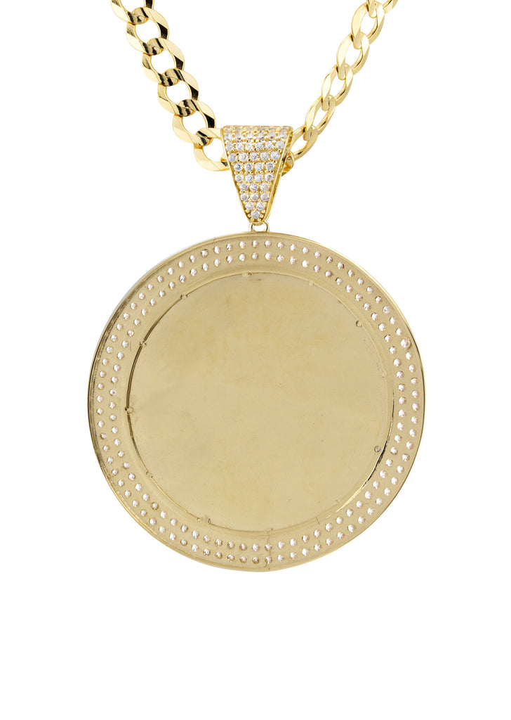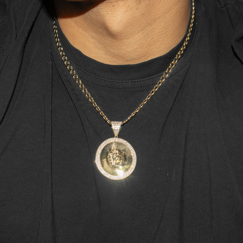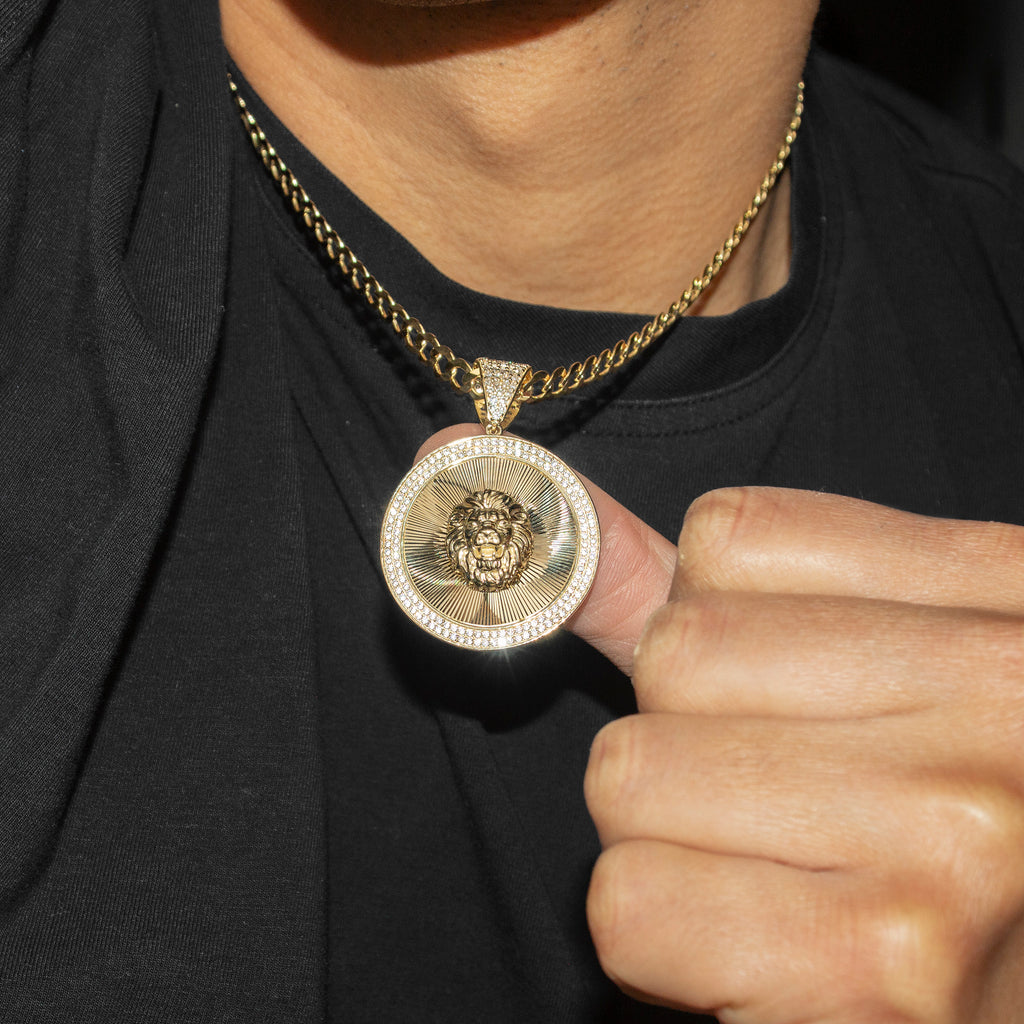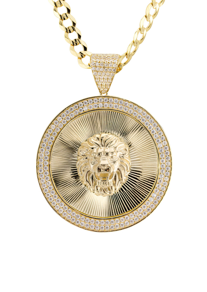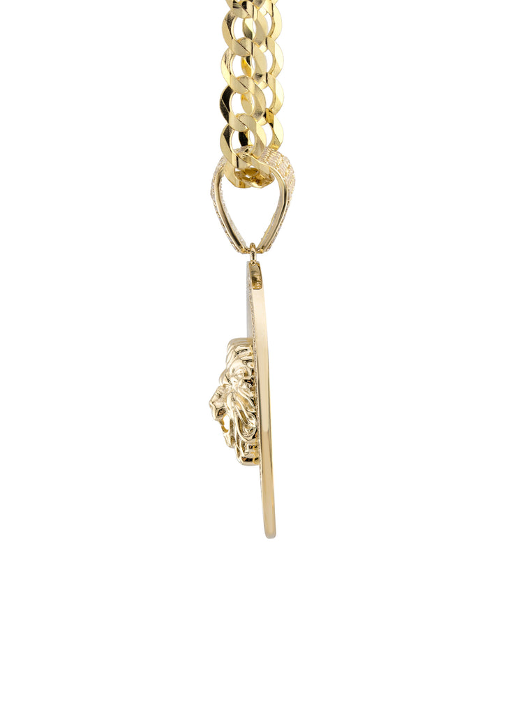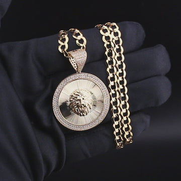 10K Yellow Gold Round Lion Head Necklace Encrusted With Cubic Zirconia Crystals With An Approximate Total Gram Weight Of 21.6. Pendant Weighs 7.6 Grams And The Chain Weighs 14 Grams. The Pendant Measurement Is 1.4 inches In Width And A Length Of 1.9 inches. The Length And Type Of The Chain Can Be Adjusted Or Select The No Chain Option.