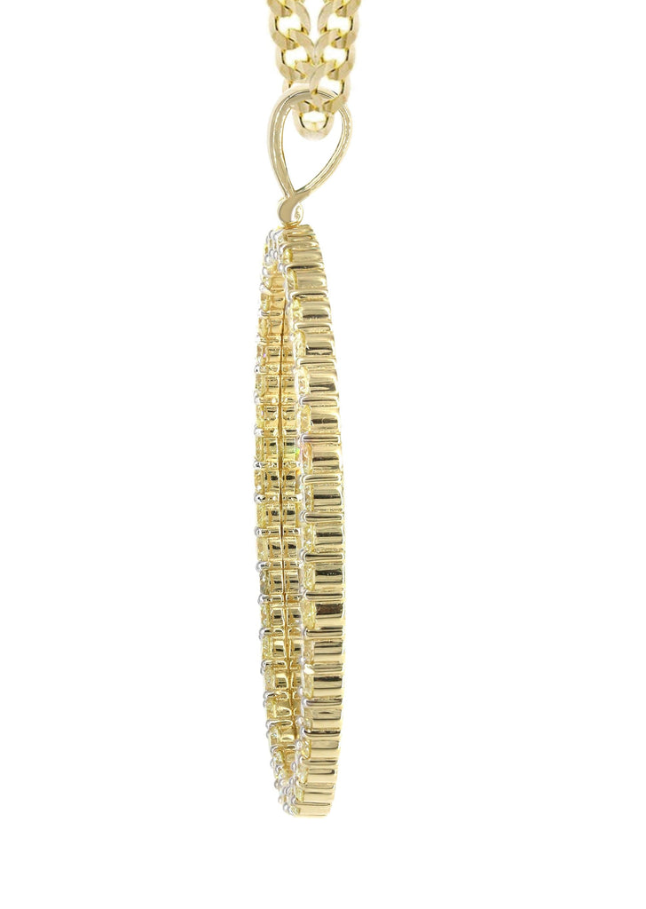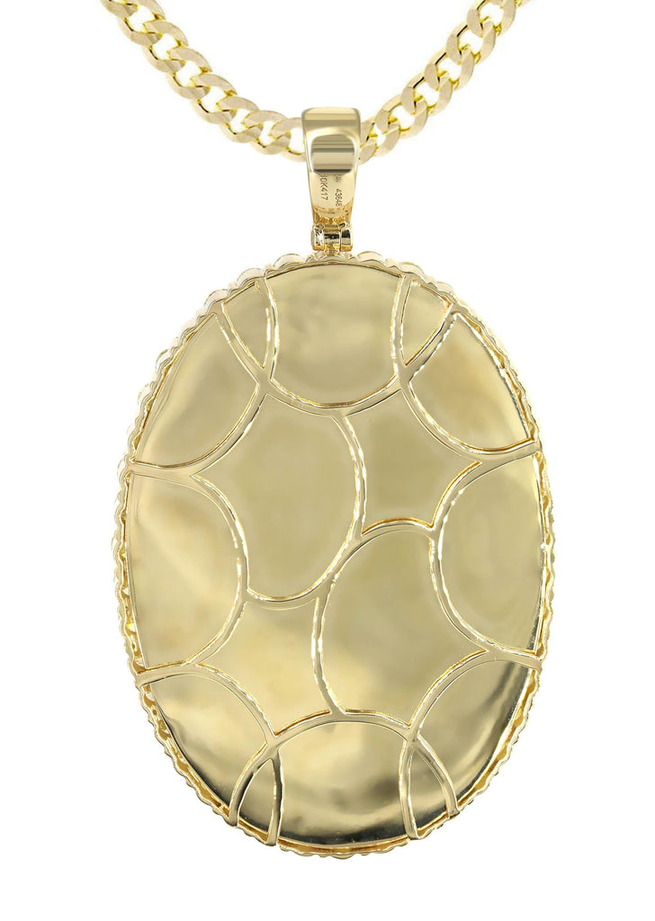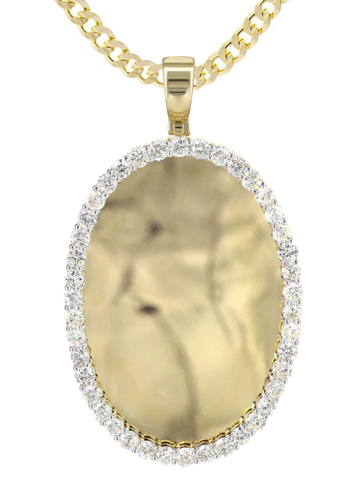 10K Yellow Gold 5.44 Carat Diamond Picture Pendant Necklace. The chain options include a 10K gold Cuban chain, Franco or Rope with a width of 3 MM and the length can be selected to any preference. Total Gram Weight Is 29. Pendant weighs 19 grams and the chain weighs approximately 10 Grams. Upon placing order, we will contact you for a picture to put on the pendant. Due to the custom nature of this product, please allow up to 1 week for production. |