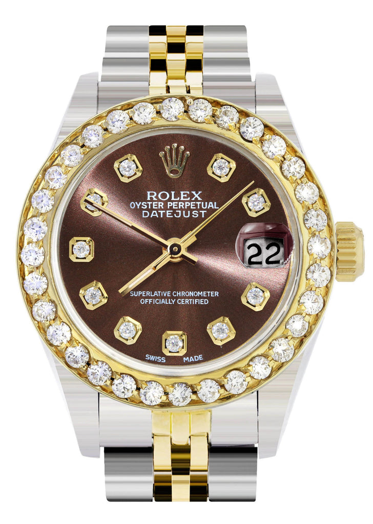 Womens Diamond Gold Rolex Watch | 1 Carat Bezel | 26Mm | Brown Diamond Dial | Jubilee Band