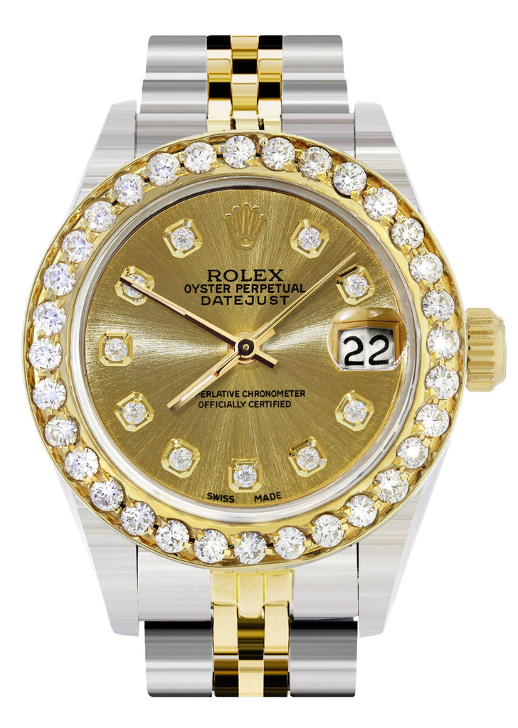 Womens Diamond Gold Rolex Watch | 1 Carat Bezel | 26Mm | Gold Dial | Jubilee Band
