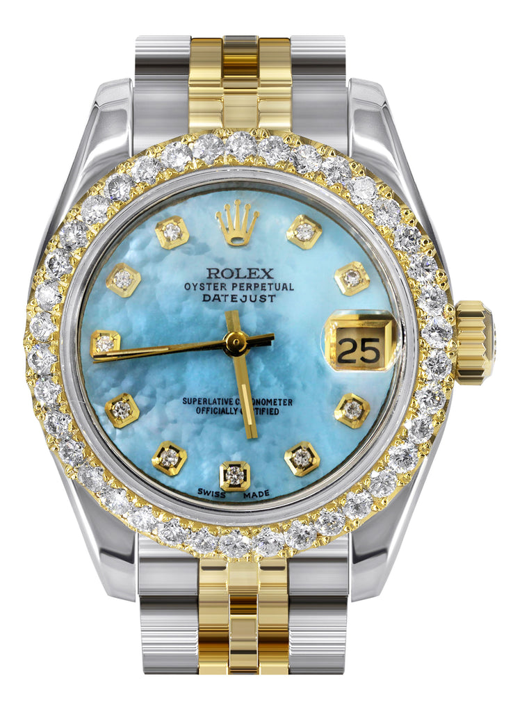 Womens Diamond Gold Hidden Clasp Rolex Watch | 1 Carat Bezel | 26Mm | Light Blue Mother of Pearl Dial | Jubilee Band | Model 179173