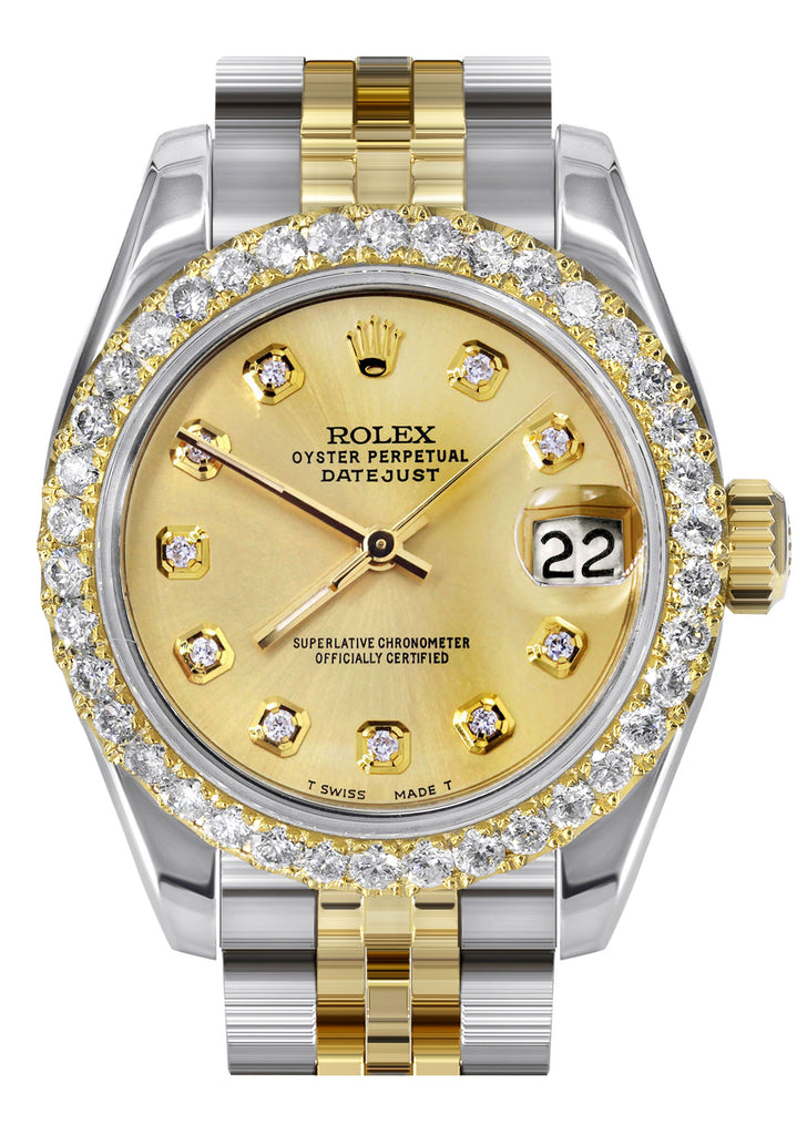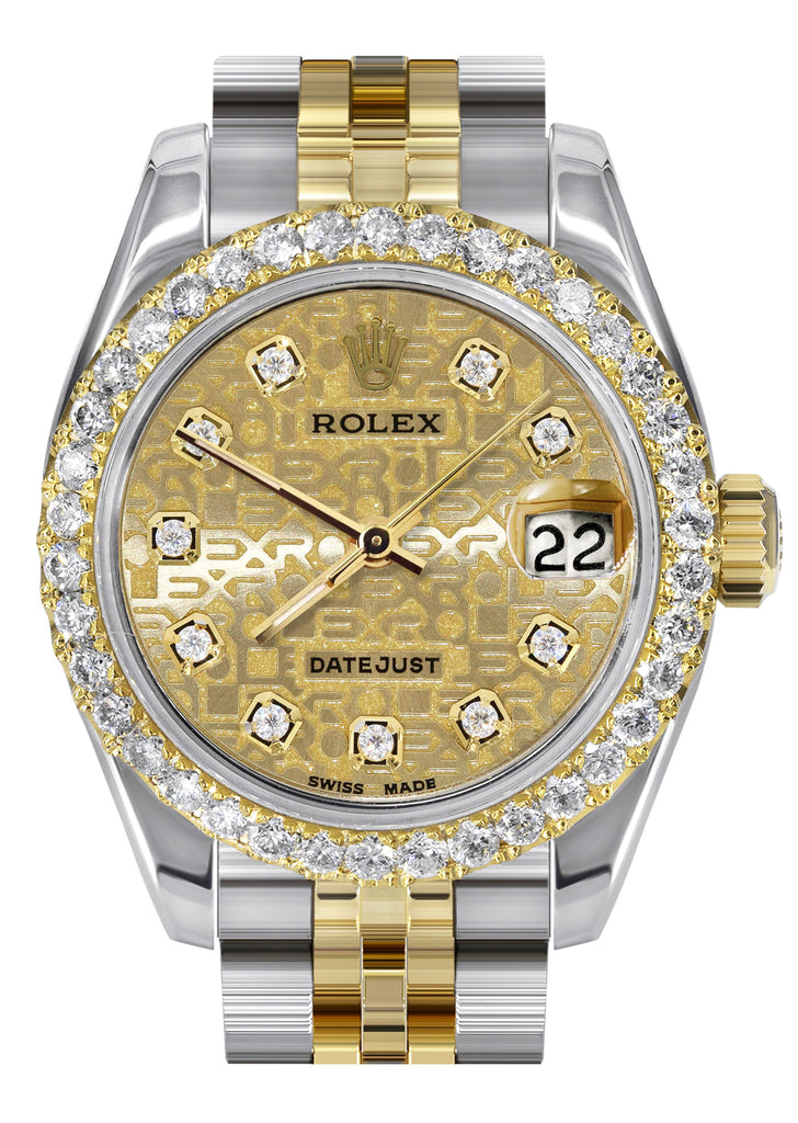 Womens Diamond Gold Rolex Watch | Diamond Bezel | 31MM | Black Diamond Dial | Jubilee Band
