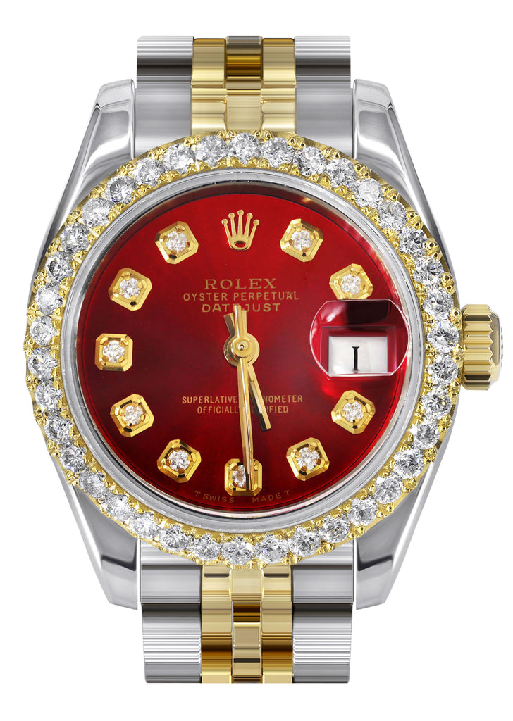 Womens Diamond Gold Hidden Clasp Rolex Watch | 1 Carat Bezel | 26Mm | Red Dial | Jubilee Band | Model 179173