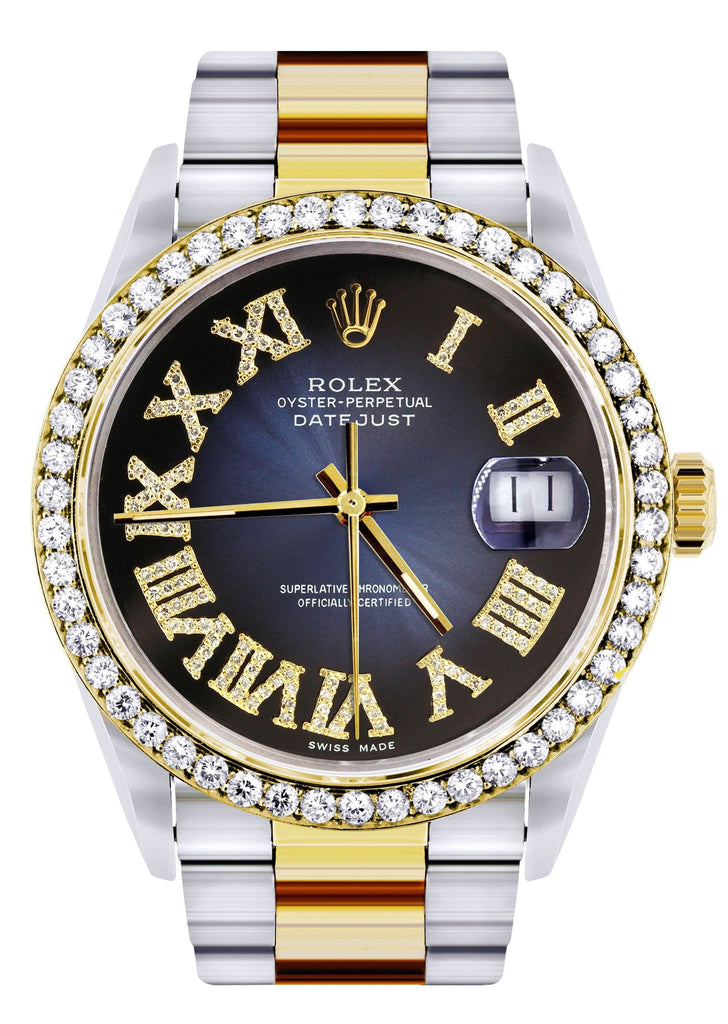 Diamond Iced Out Rolex Datejust 41 | 25 Carats Of Diamonds | Custom Blue Black Roman Numeral Diamond Dial | Two Tone | Two Row | Oyster Band