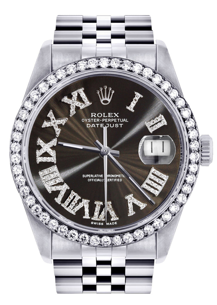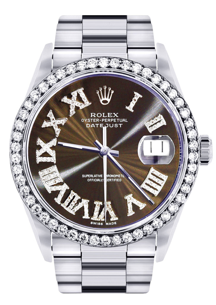 Iced Out Rolex Datejust 36 MM | Stainless Steel | 10 Carats of Diamonds | Brown Roman Diamond Dial | Oyster Band