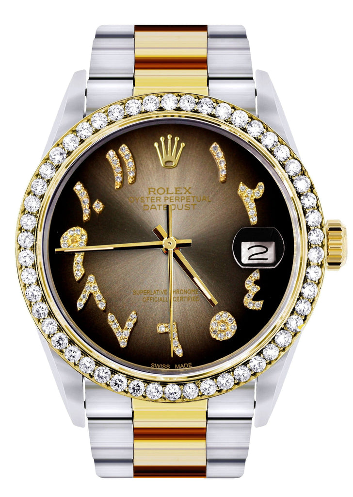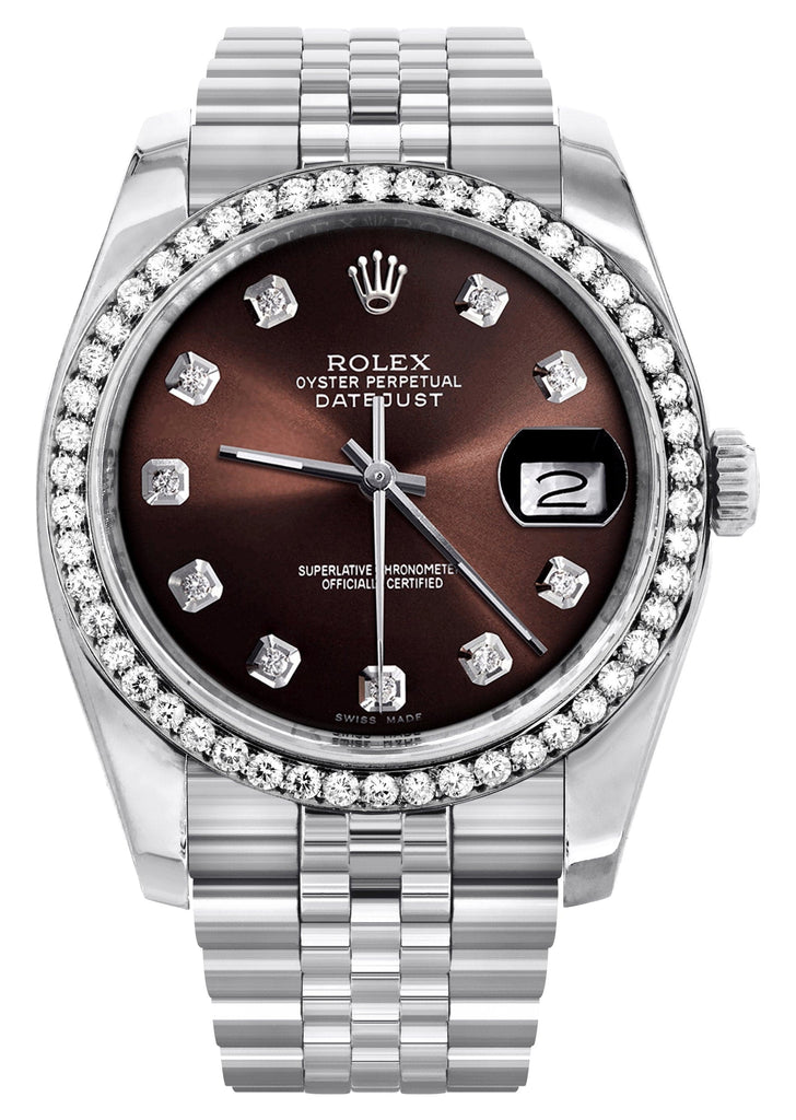 Iced Out Rolex Datejust 36 MM | Stainless Steel | 10 Carats of Diamonds | Brown Arabic Diamond Dial | Jubilee Band