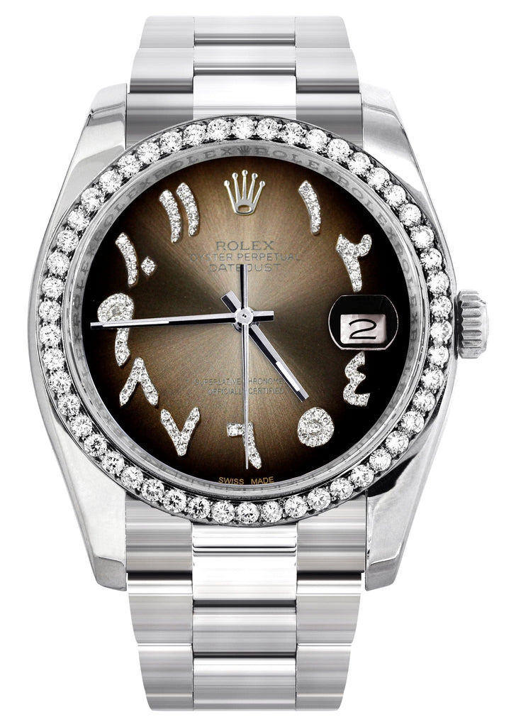 Iced Out Rolex Datejust 36 MM | Stainless Steel | 10 Carats of Diamonds | Brown Arabic Diamond Dial | Oyster Band