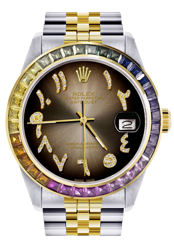 Diamond Gold Rolex Watch For Men 16233 | 36Mm | Rainbow Sapphire Bezel | Diamond Brown Arabic Numeral Dial | Jubilee Band